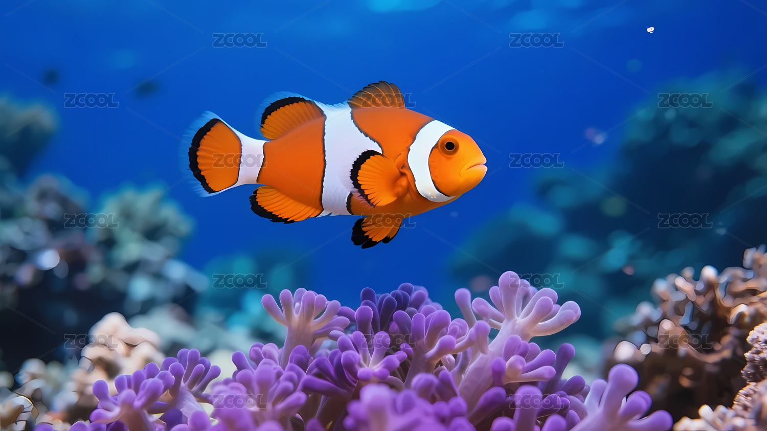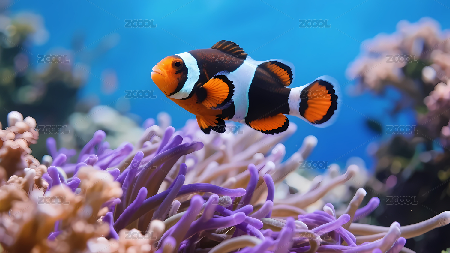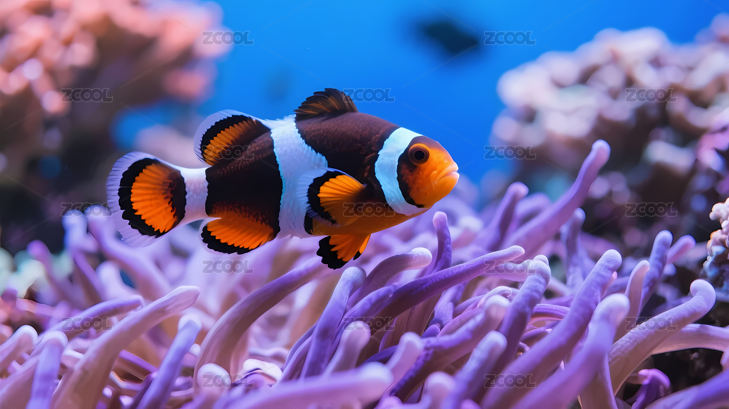 海葵鱼深蓝珊瑚前景紫色