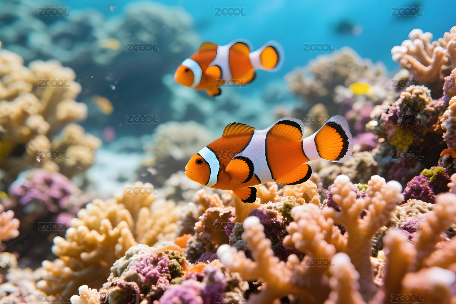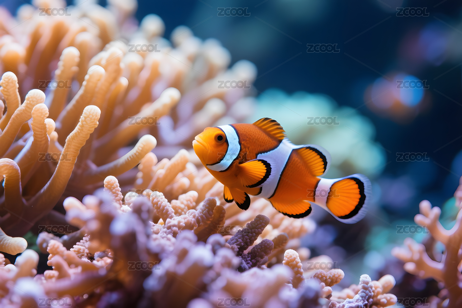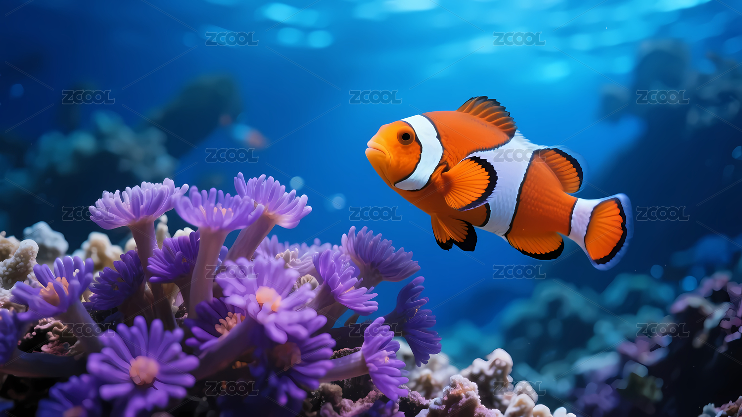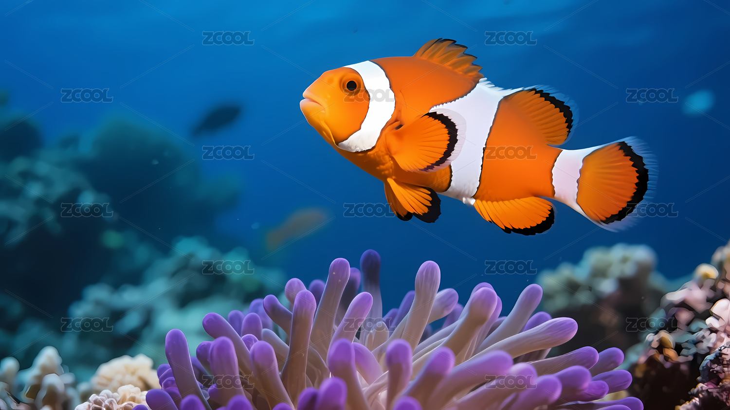 海葵鱼深蓝珊瑚前景紫色