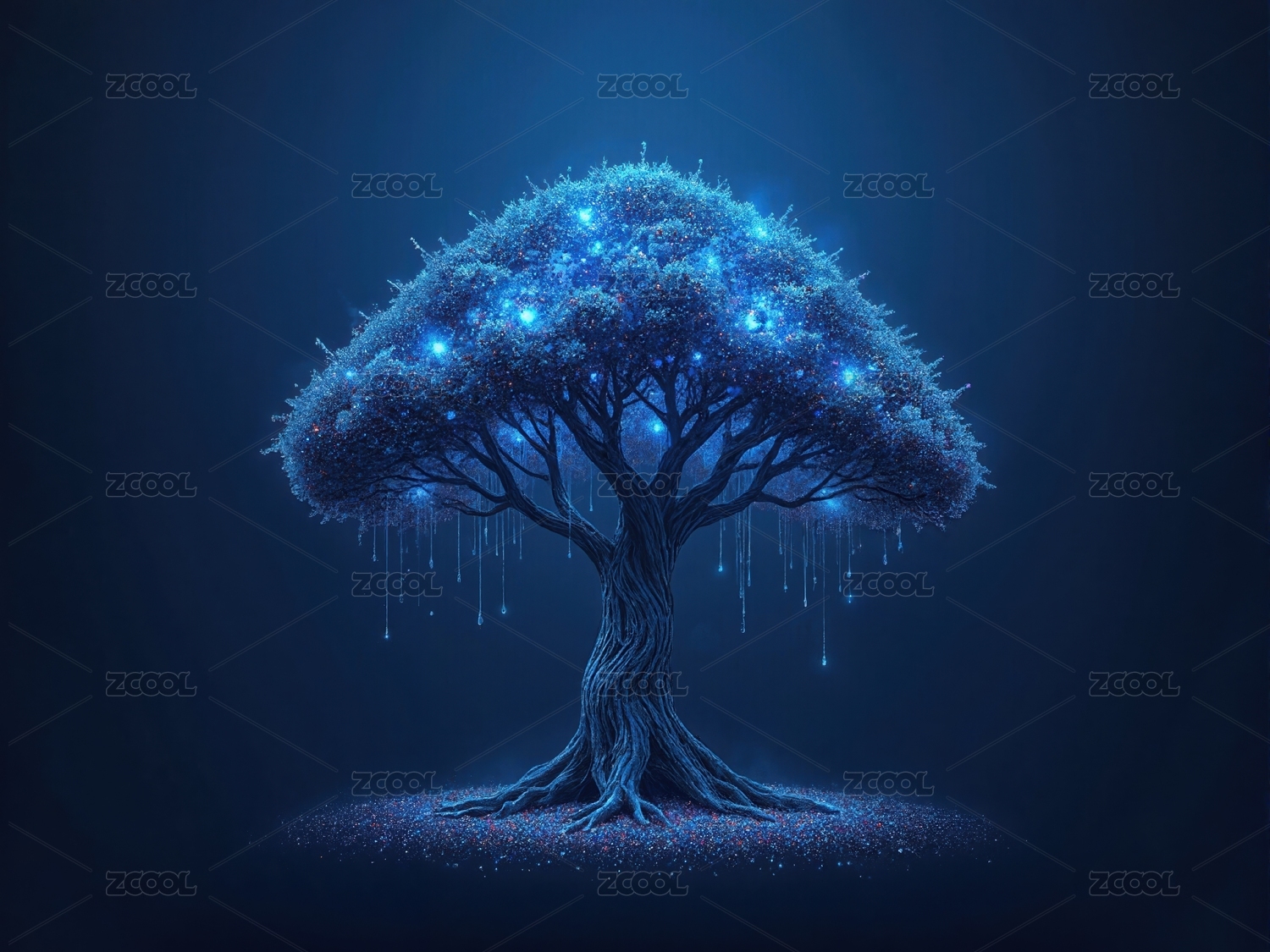 蓝色,树,梦幻,夜空,星星,发光,枝叶,根,地面,背景