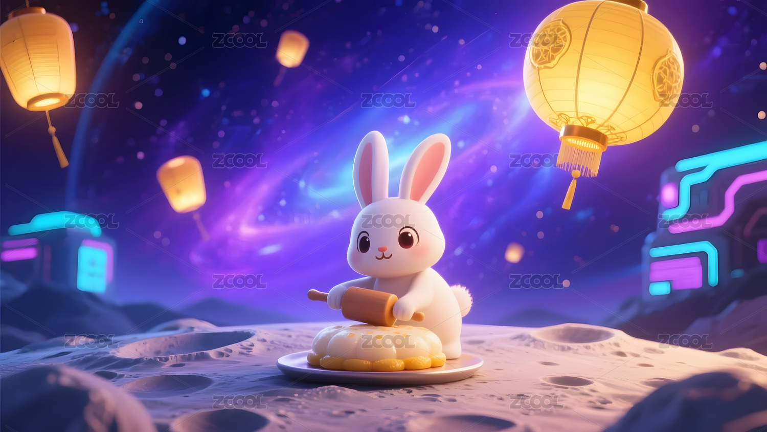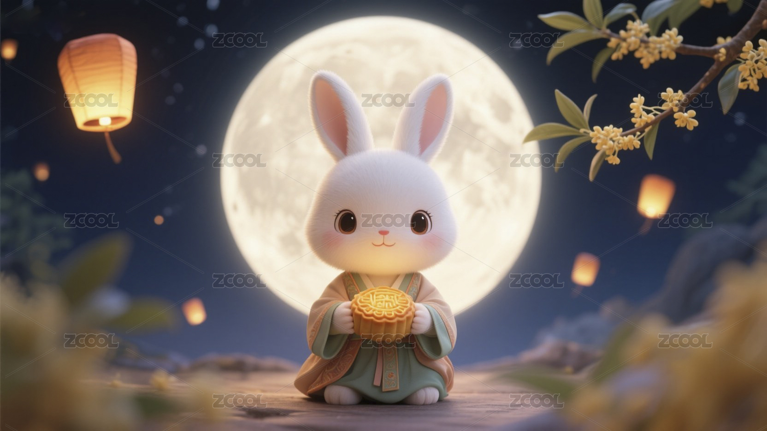 白色,宁静,蓝色,兔子,灯笼,满月,花瓣,平台,梦幻,光晕