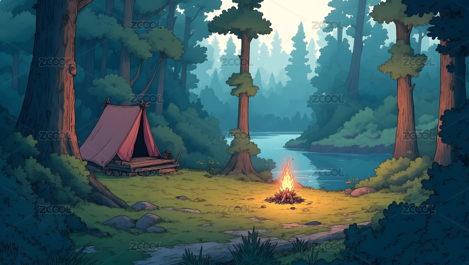 森林湖畔露营篝火