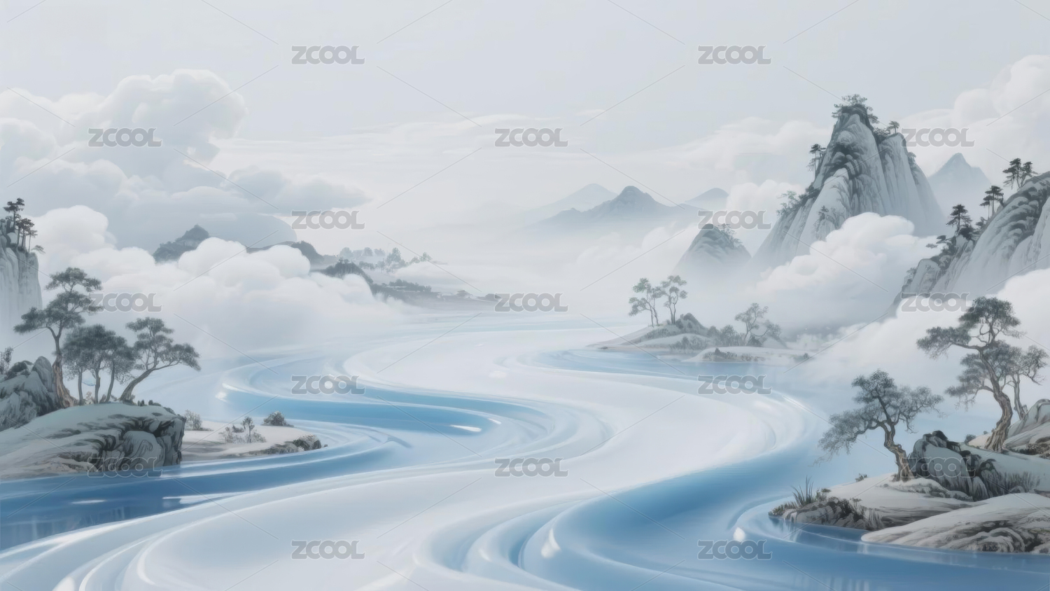 自然,山水, 云雾, 树木, 河流, 石头, 天空, 蓝色, 绿色, 白色