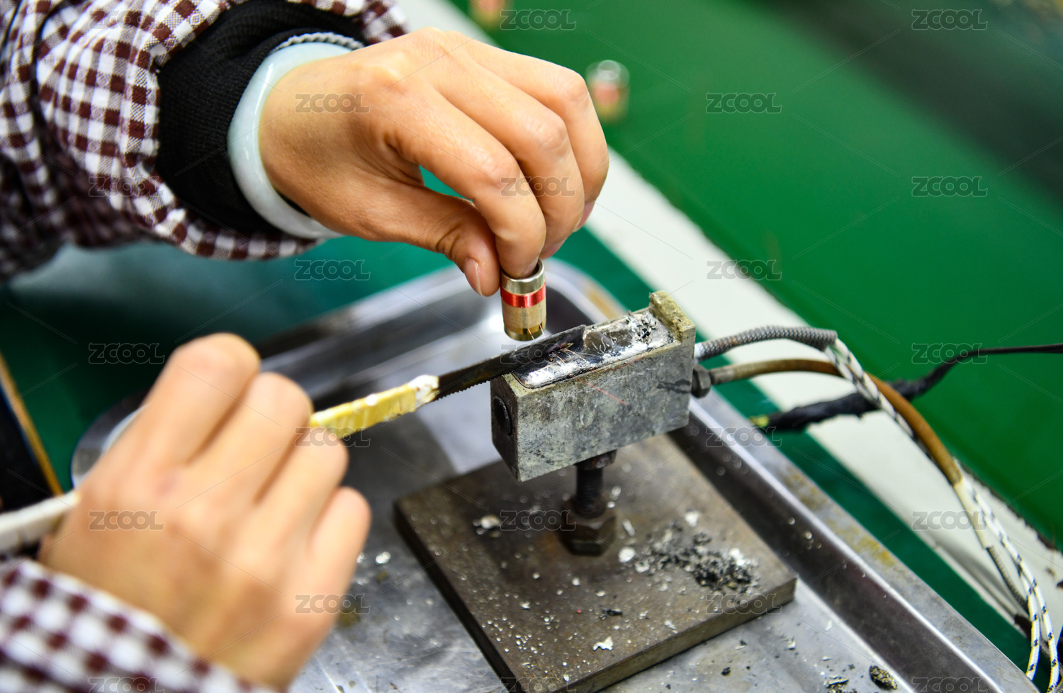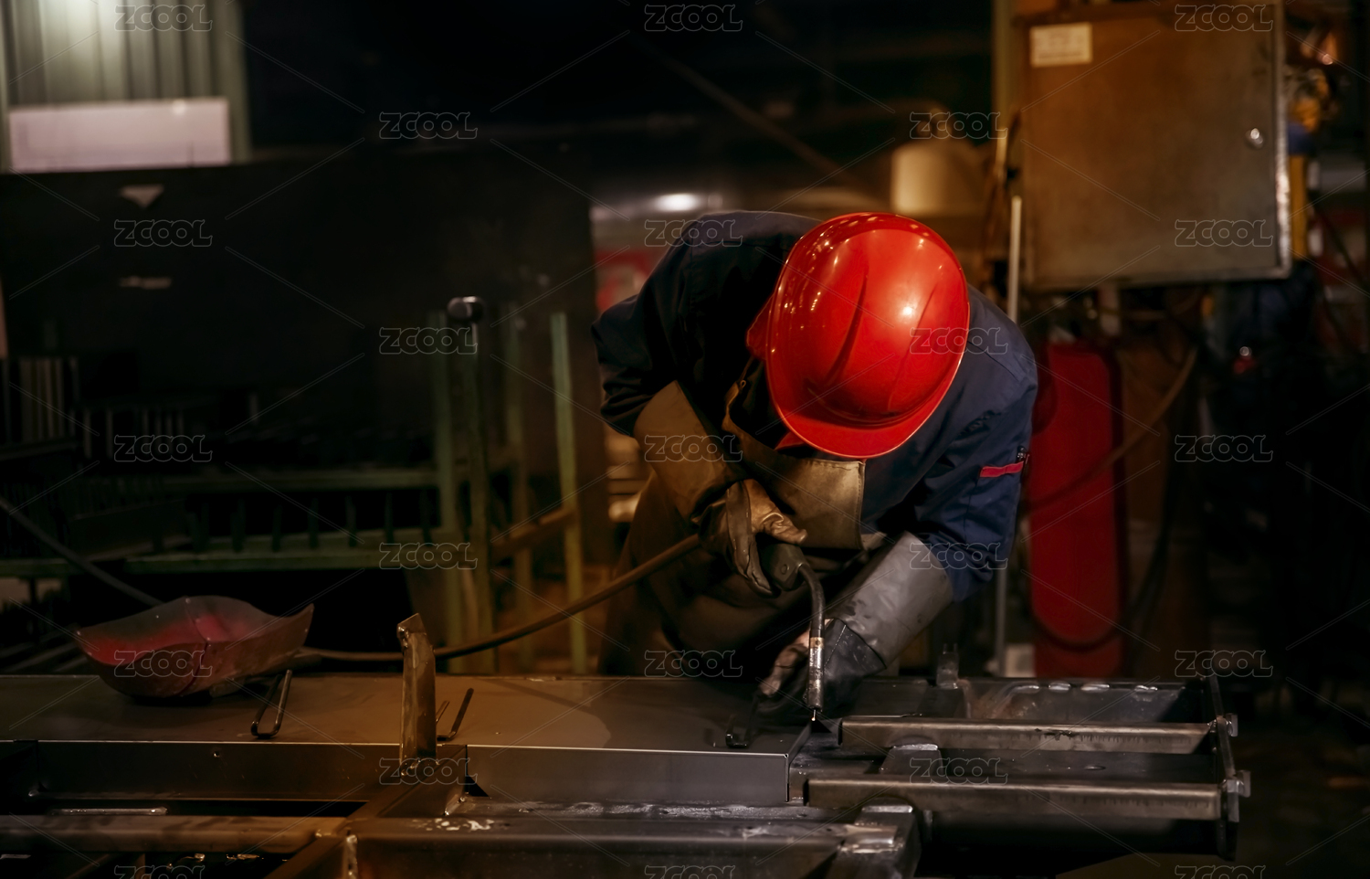 昏暗的工厂里工人正在焊接铁框,喷射火花