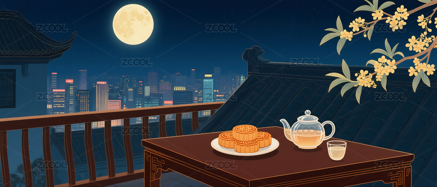 中国传统节日中秋节月亮下桌上的月饼和茶壶
