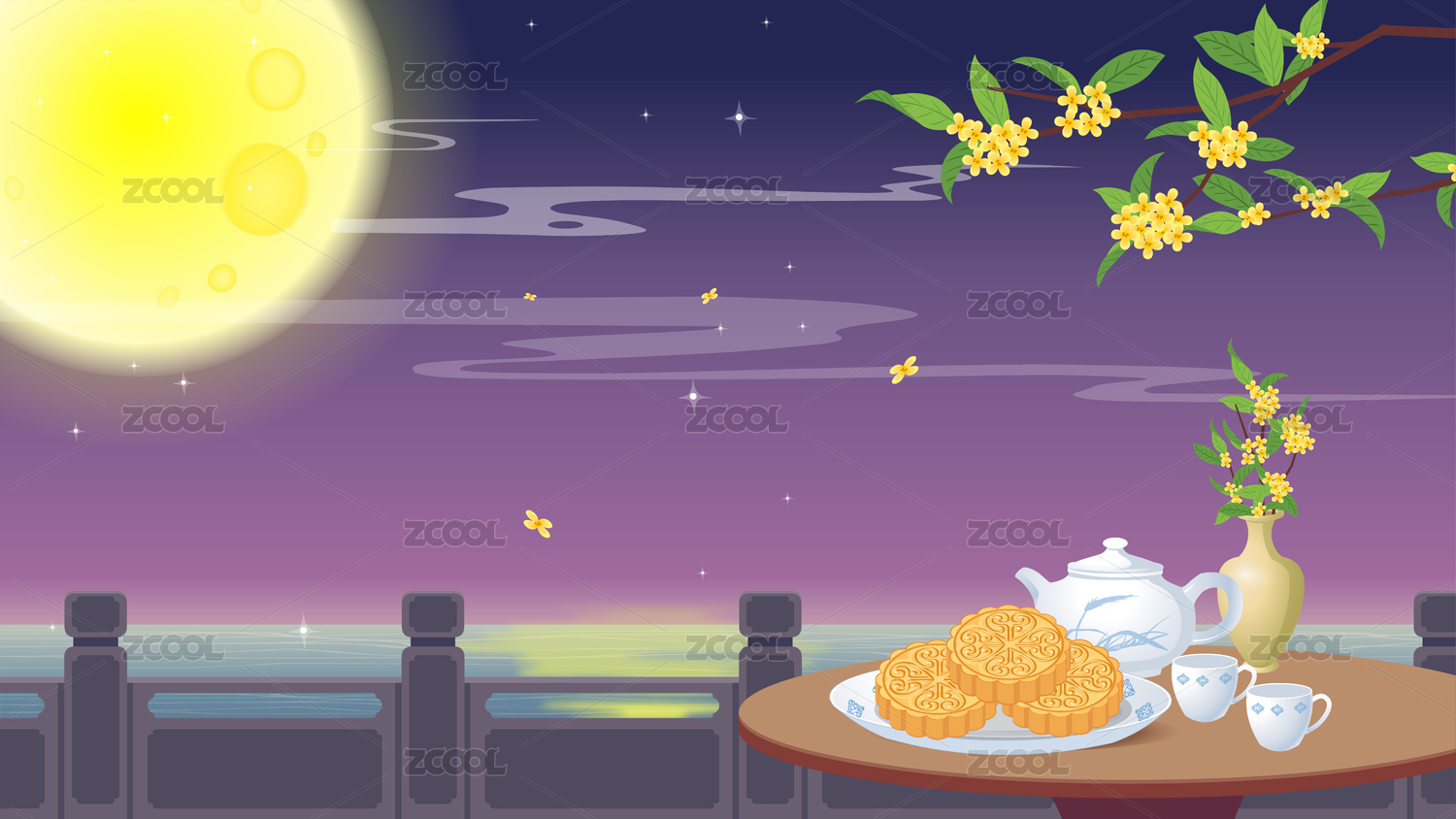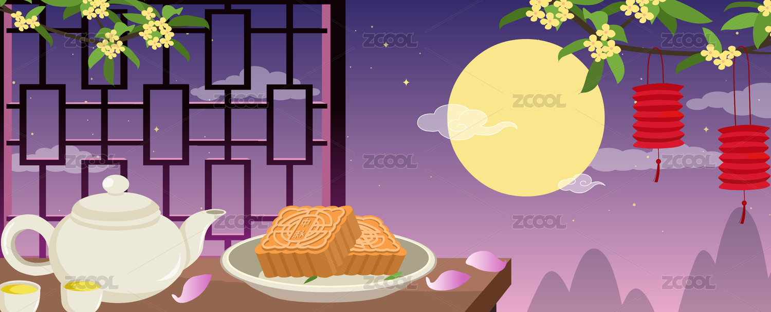中秋节紫色中式月亮下的月饼桂花树云雾插画