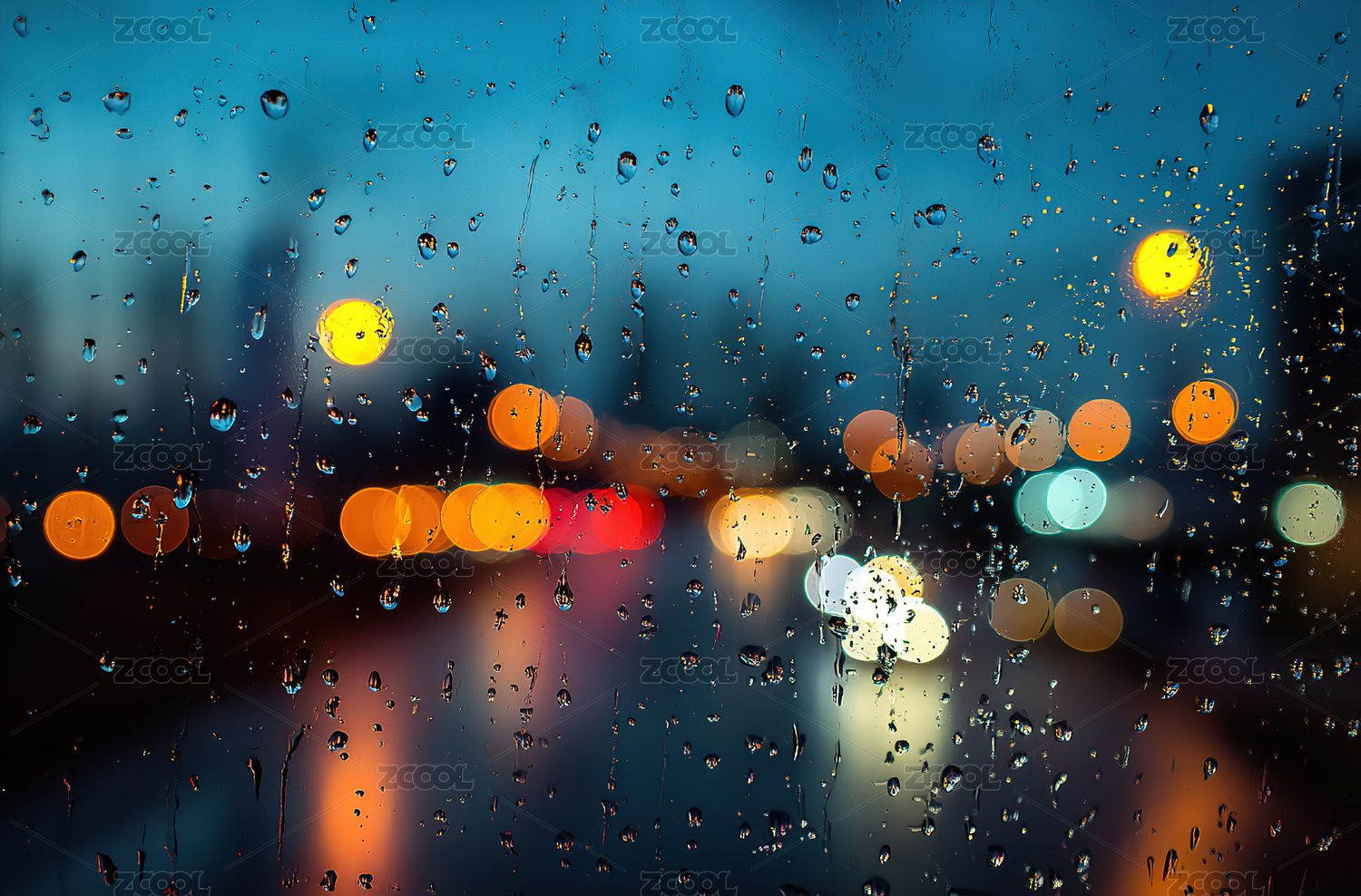 背景是城市灯光窗玻璃上雨滴的散景照片