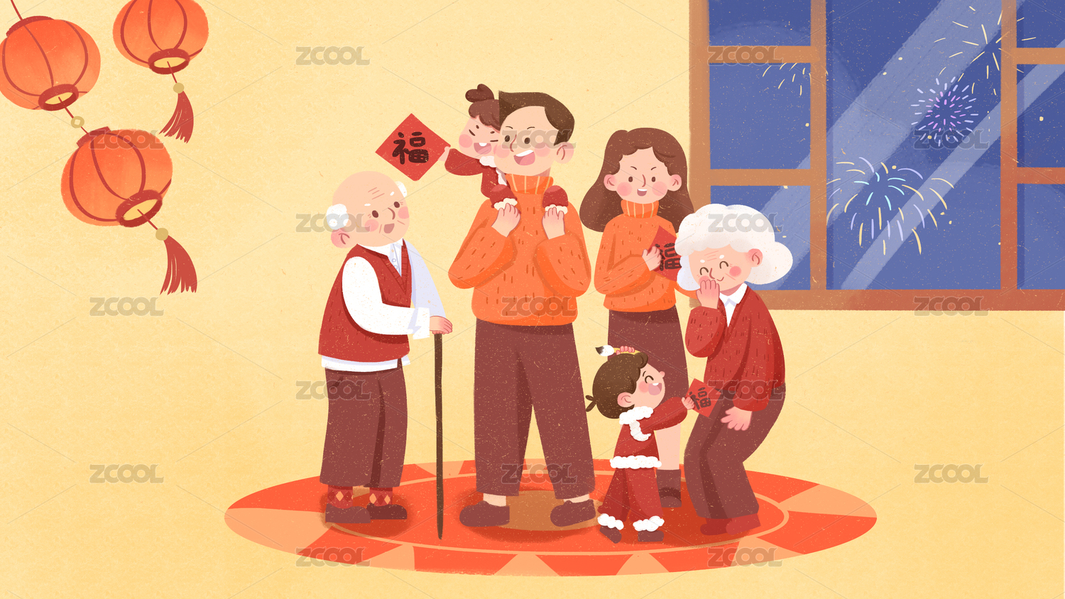 2020年新年年俗春节年夜饭团圆饭家人卡通中国风矢量背景插画