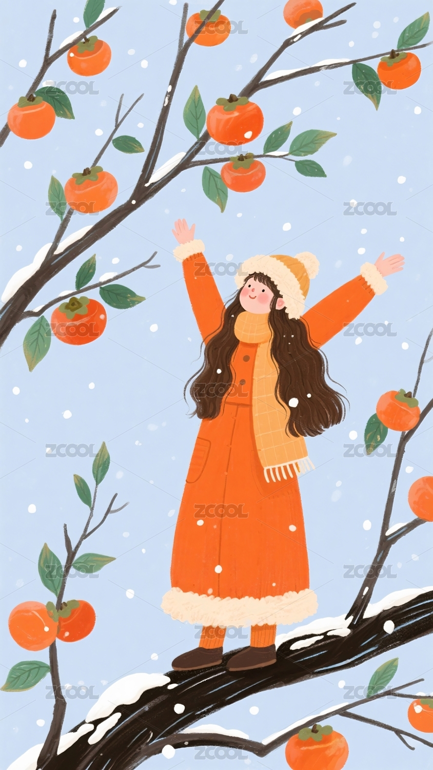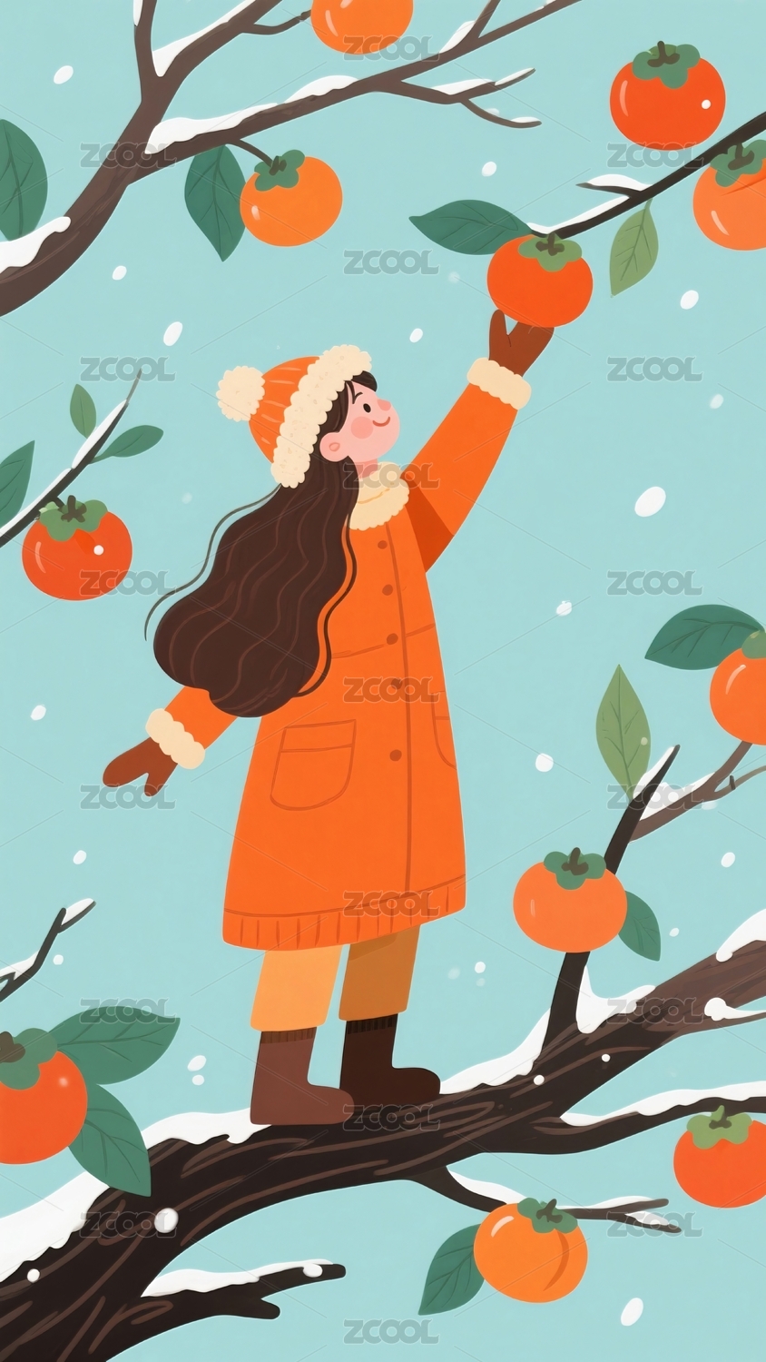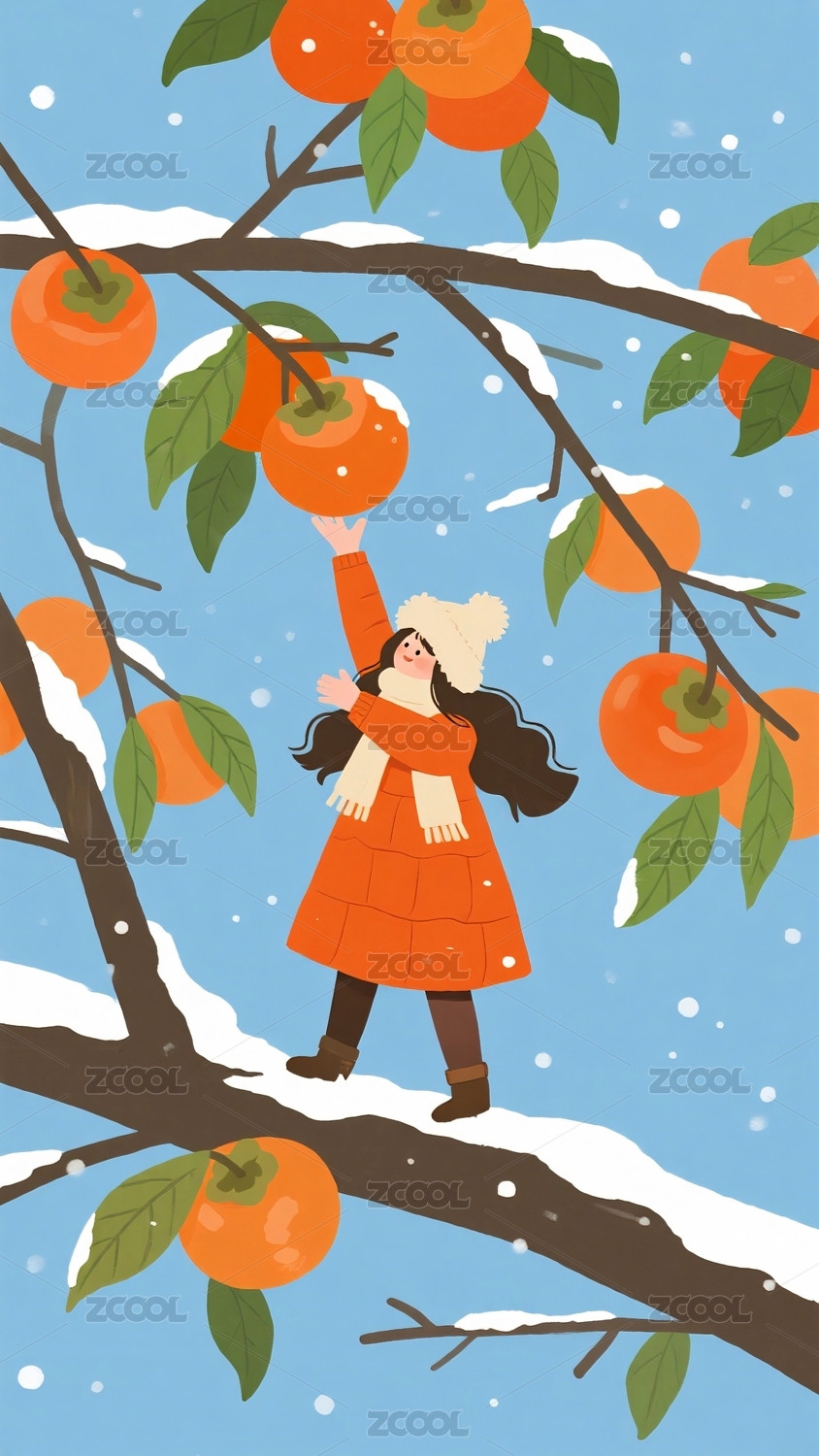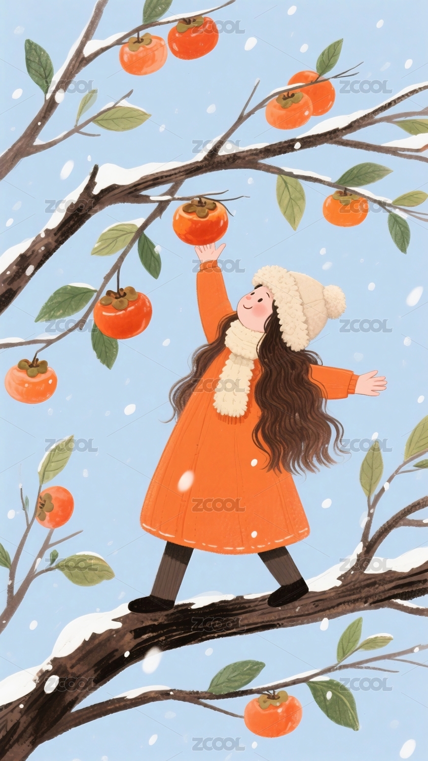 人物,阳光,微笑,柿子树,树枝,橙色,户外,采摘,果实,温暖