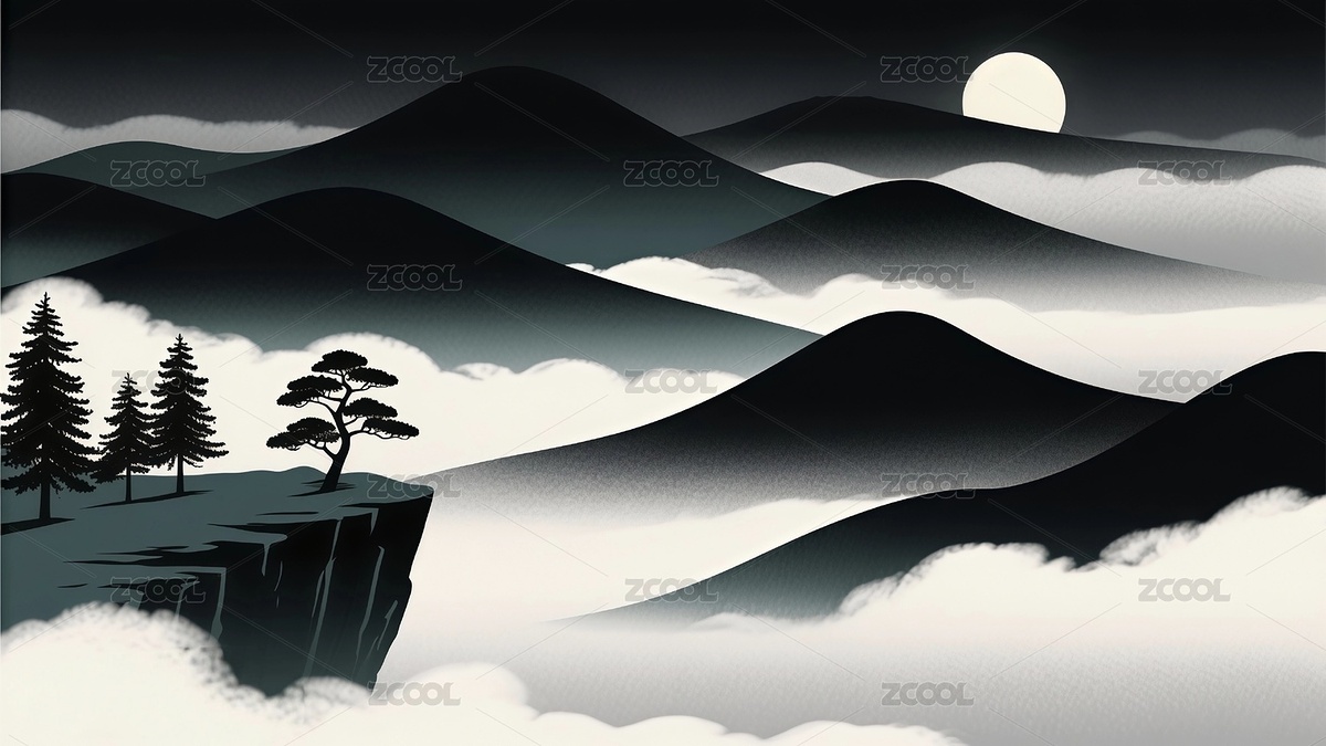 山水,水墨,山峦,连绵,立体,圆月,夜空,悬崖,树木,松树