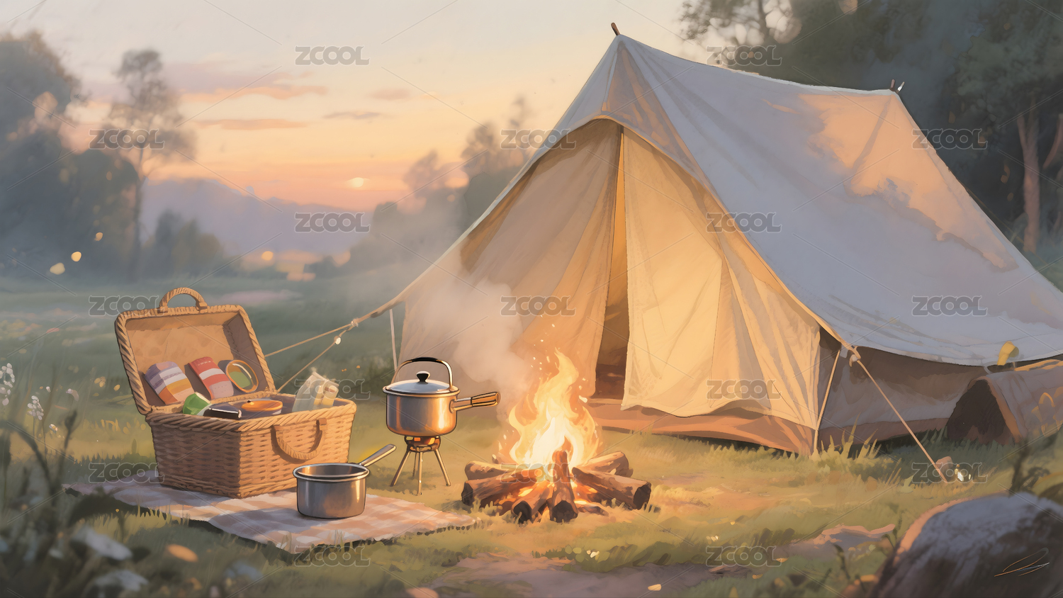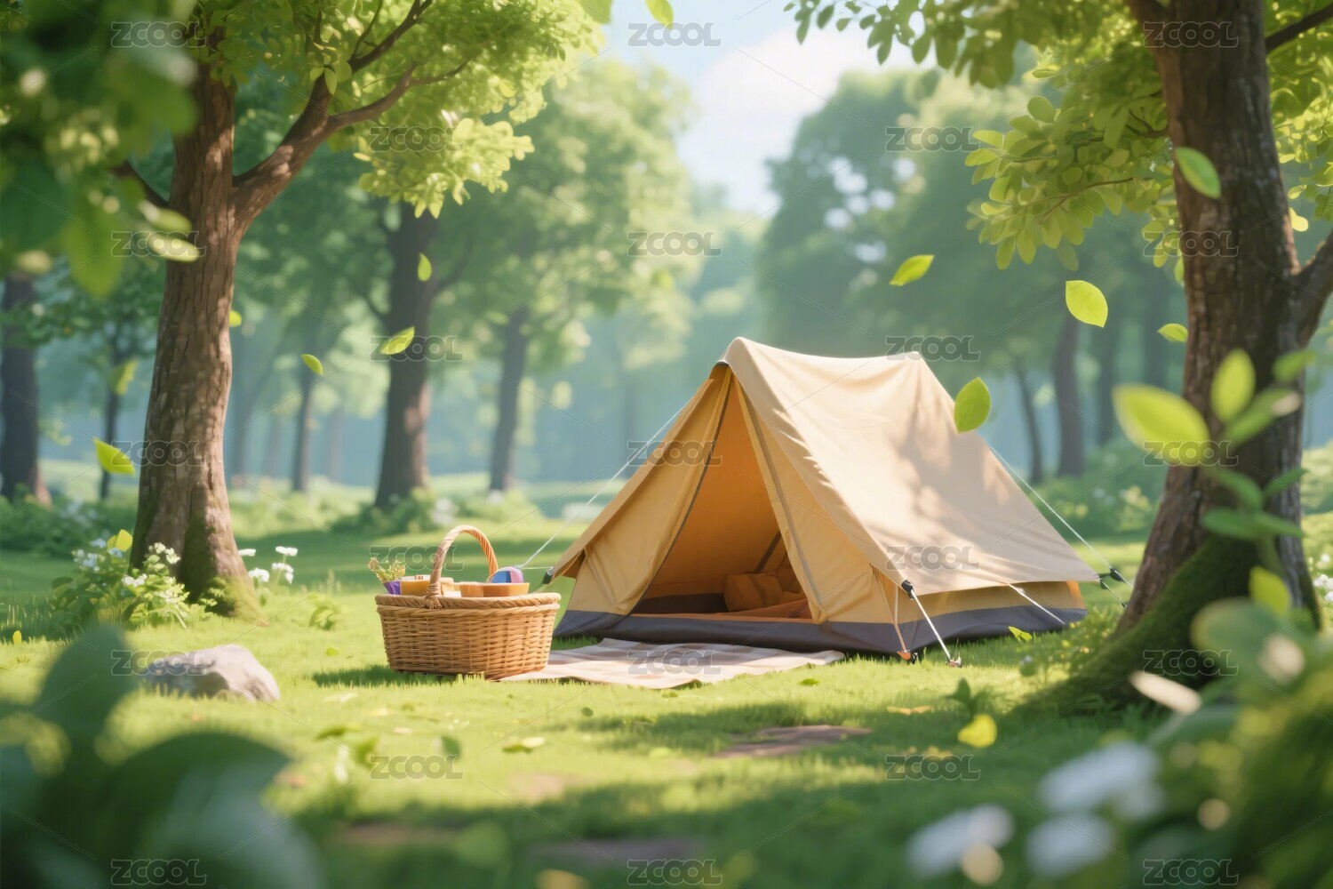户外,野餐,露营,帐篷,黄色,树旁,门帘,敞开,睡袋,草地