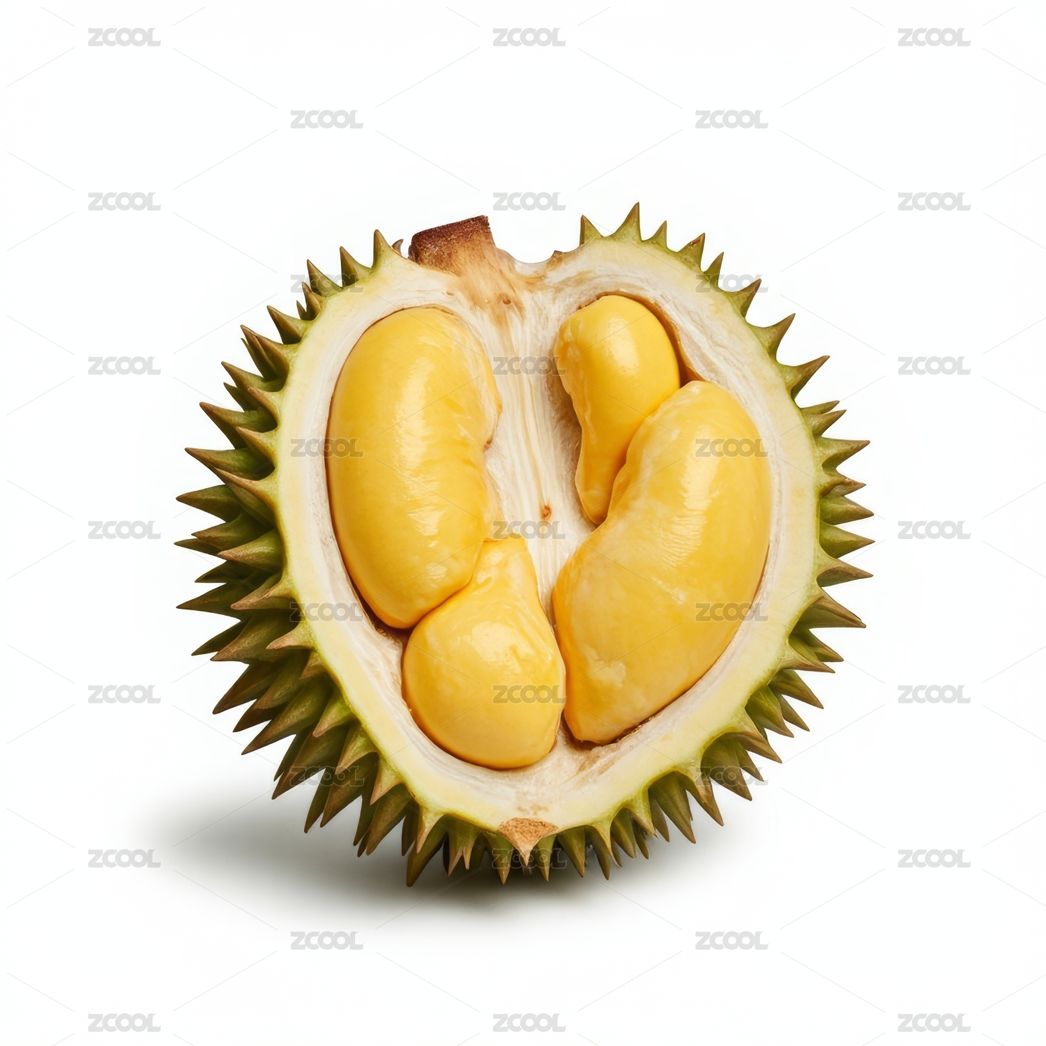 白底上剥开的半个金枕榴莲露出饱满果肉