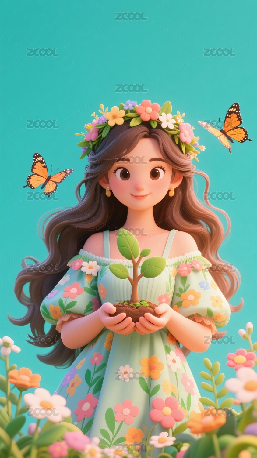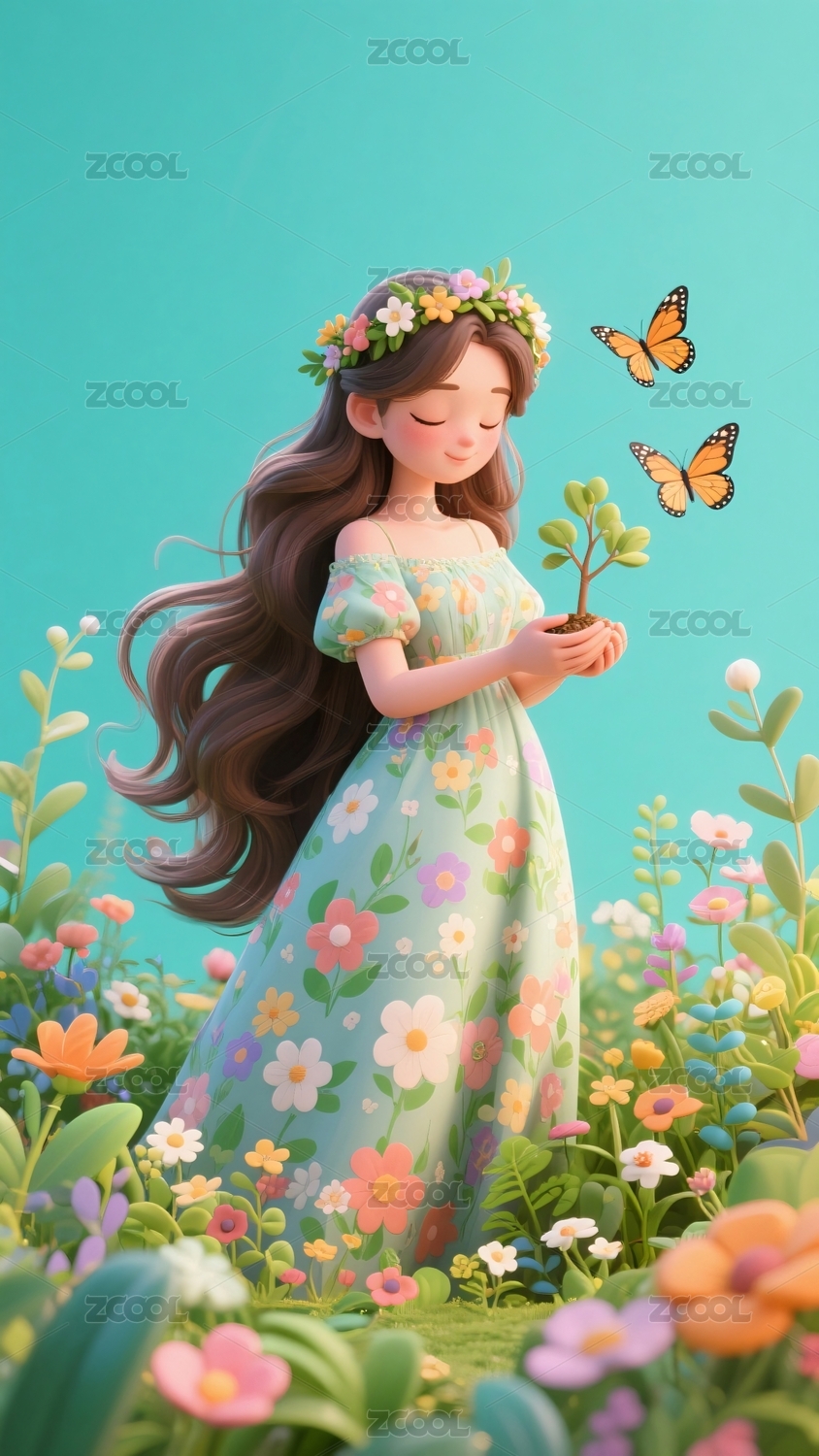 少女手捧幼苗蝴蝶飞舞