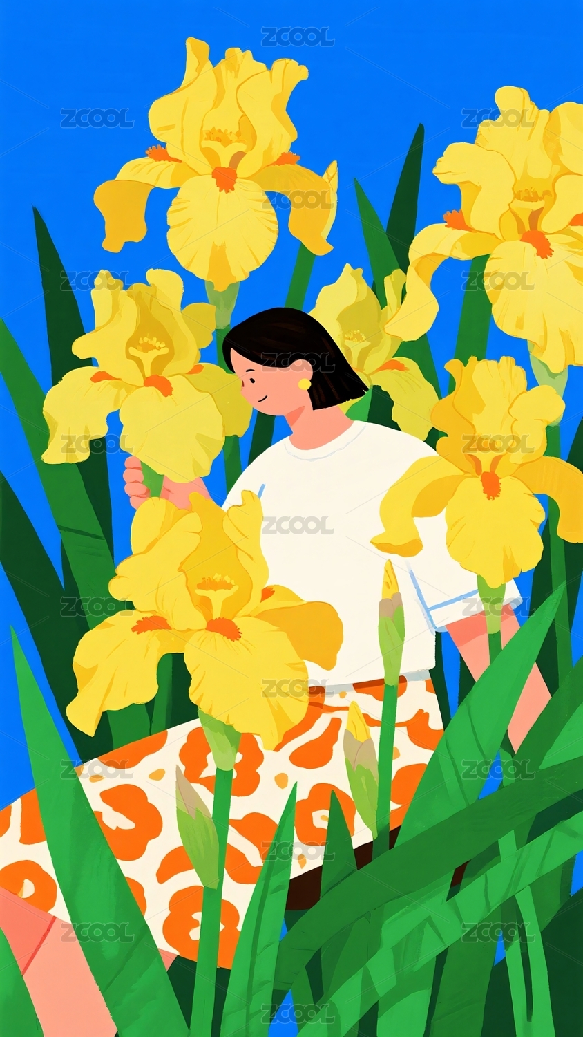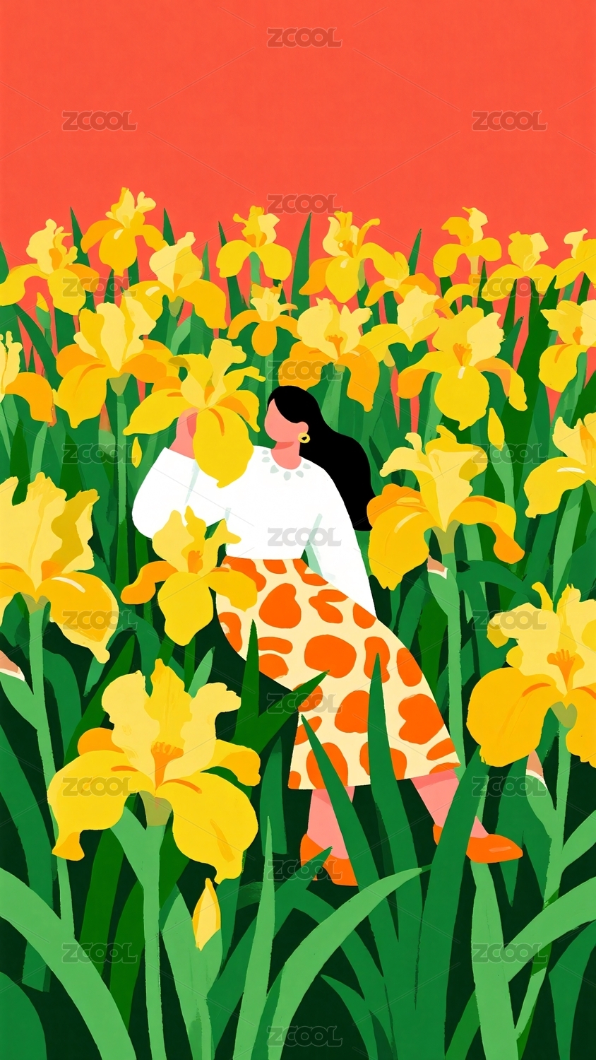 采摘黄色鸢尾花的女子