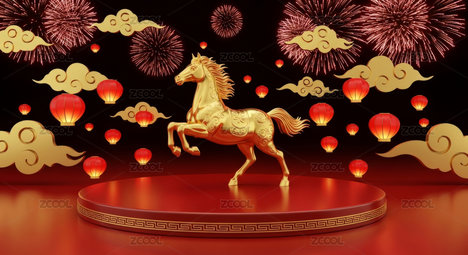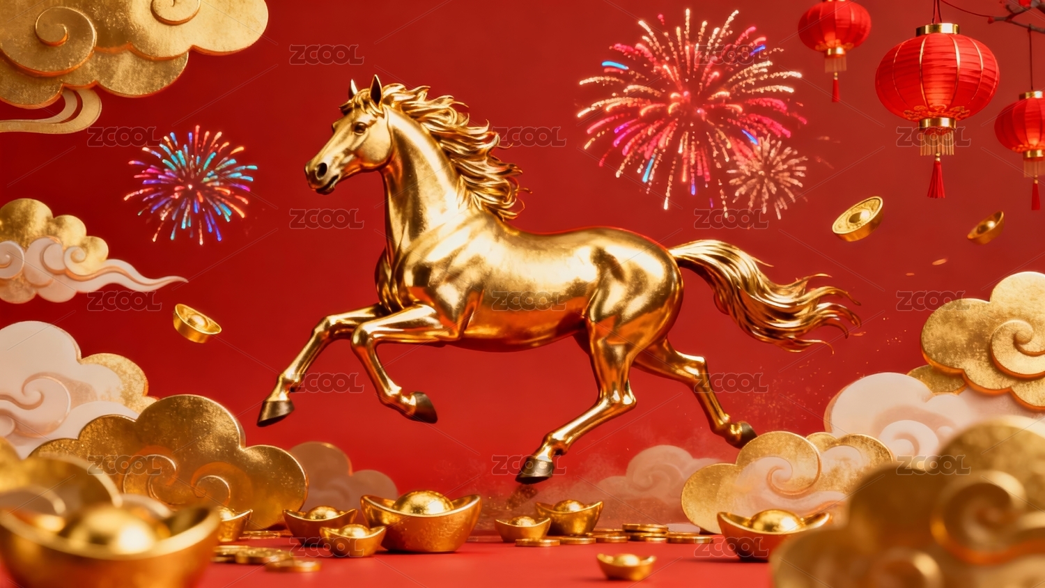 新年,烟花,财富,幸福,春节,庆典,吉祥,金色骏马,红灯笼,喜庆装饰