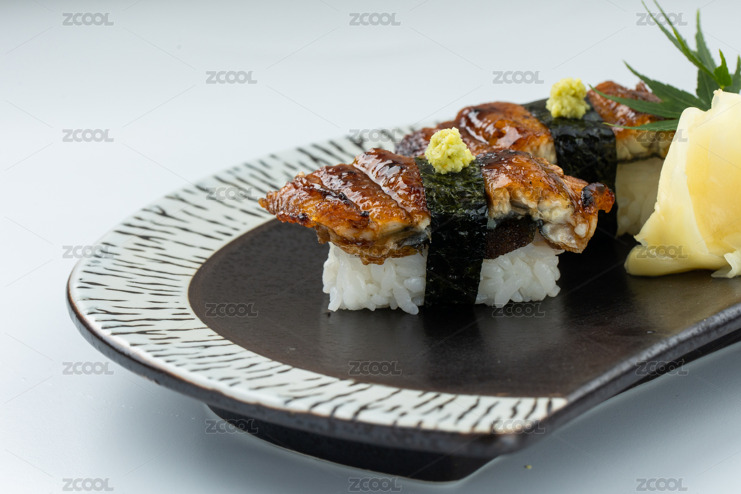 鳗鱼寿司,寿司,鳗鱼,海苔,米饭,芥末,姜片,日式料理,摆盘,餐具
