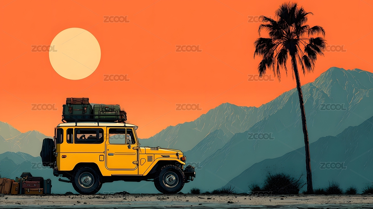 黄色吉普车沙漠之旅 阳光灿烂 热带风情