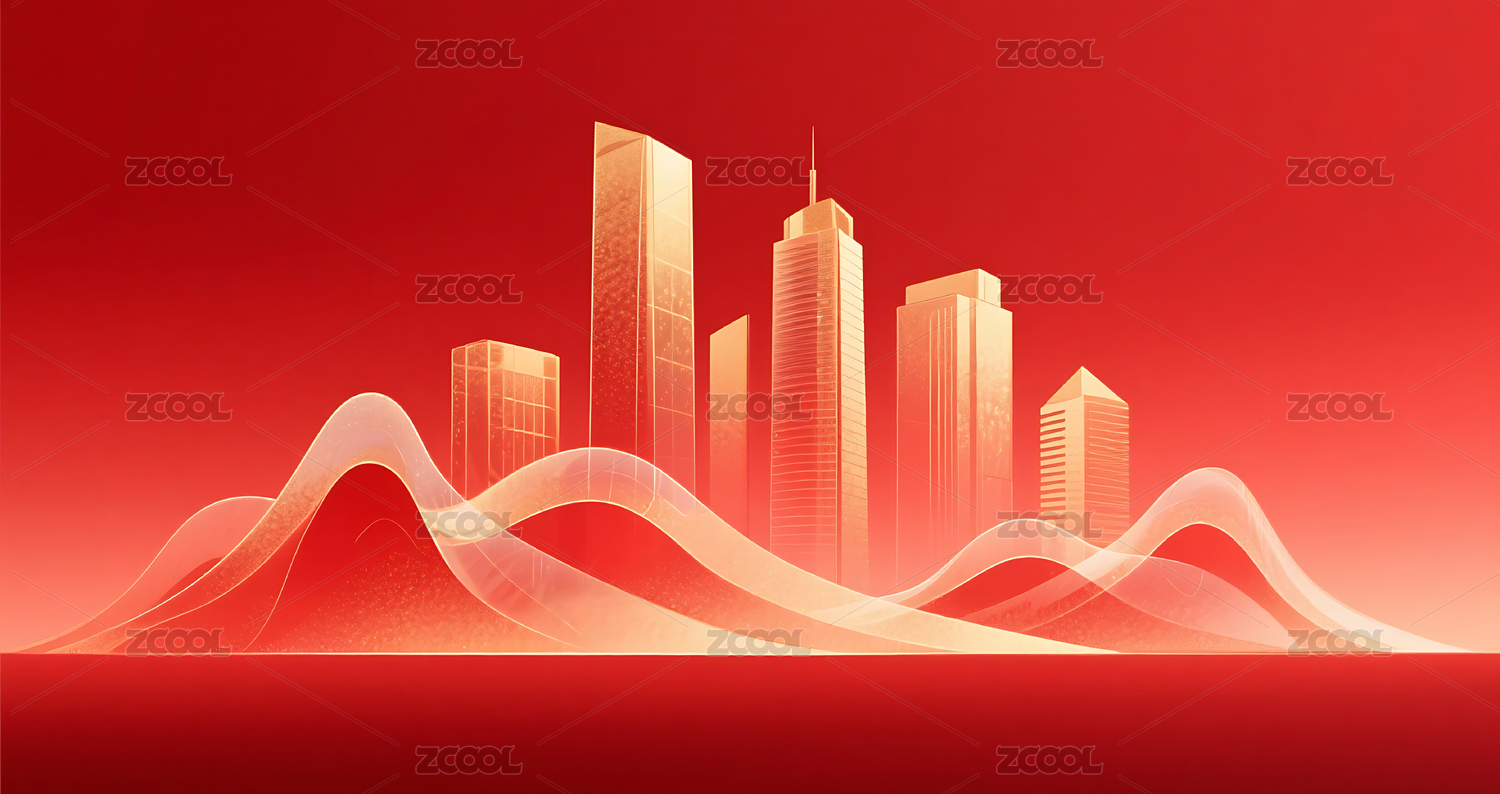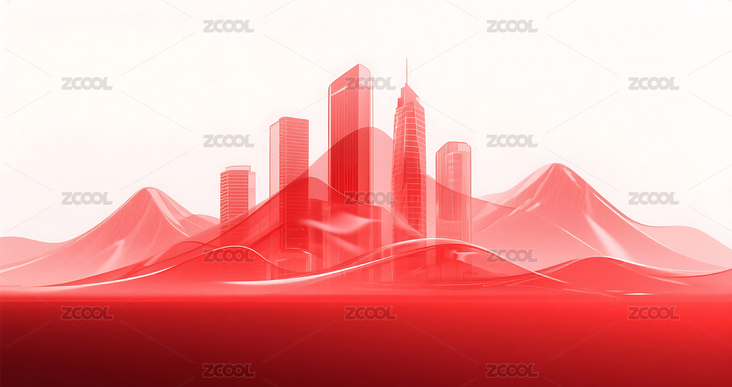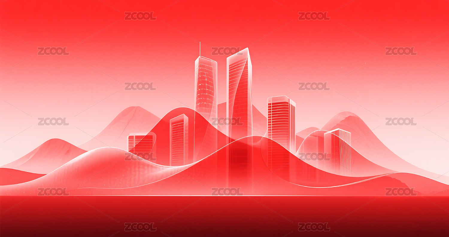 红色渐变简约半透明城市建筑山峰背景