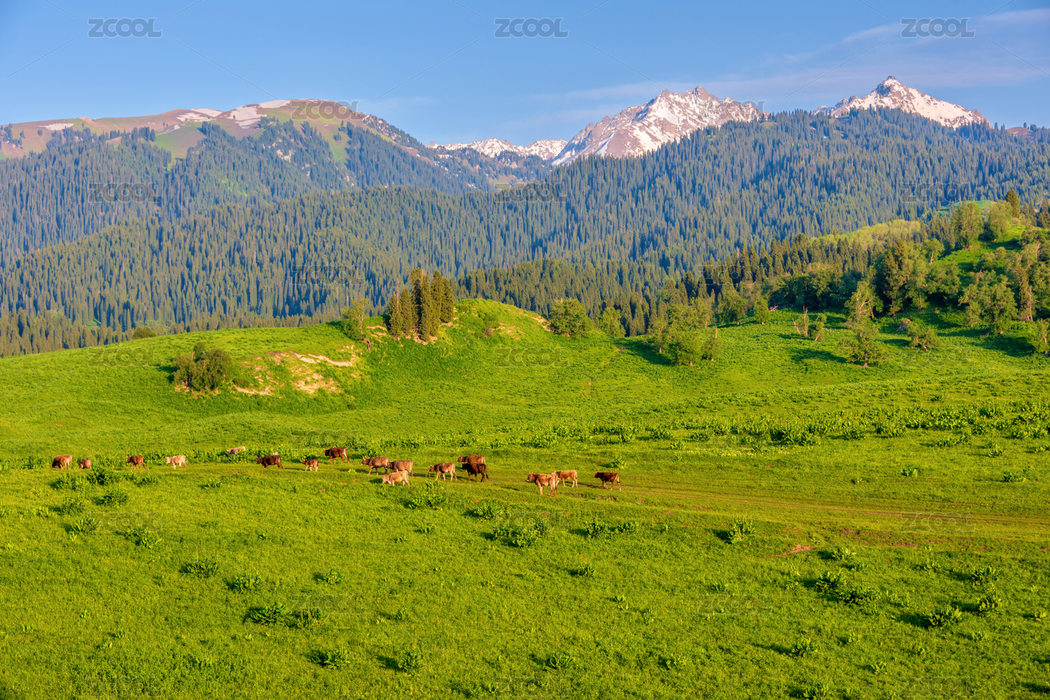 中国新疆伊犁那拉提草原高山草甸牧场牛羊