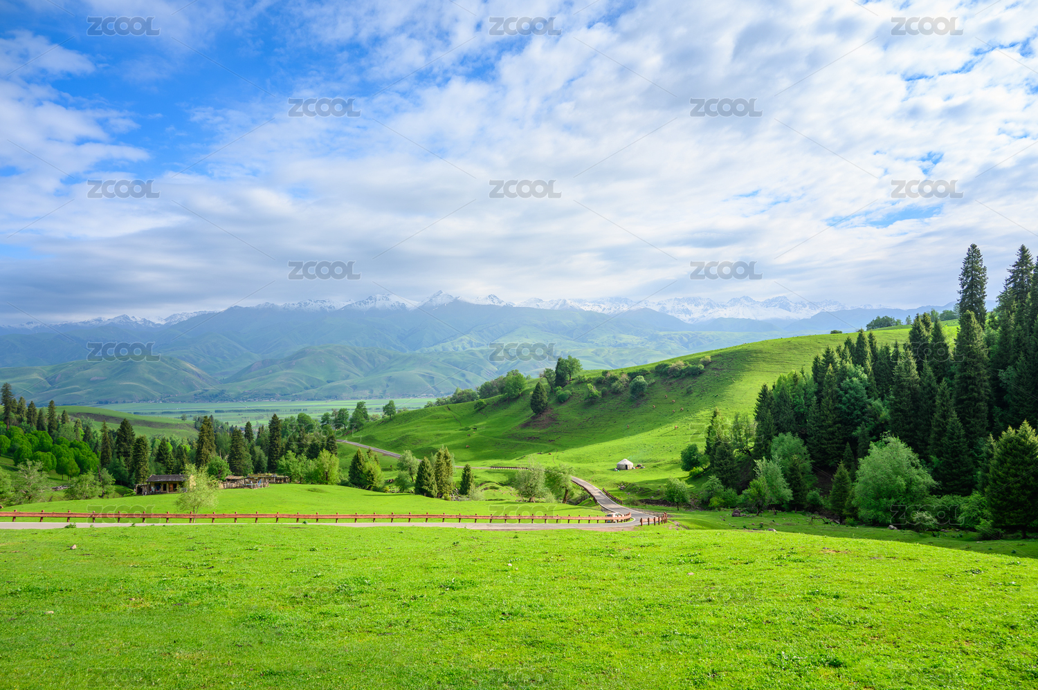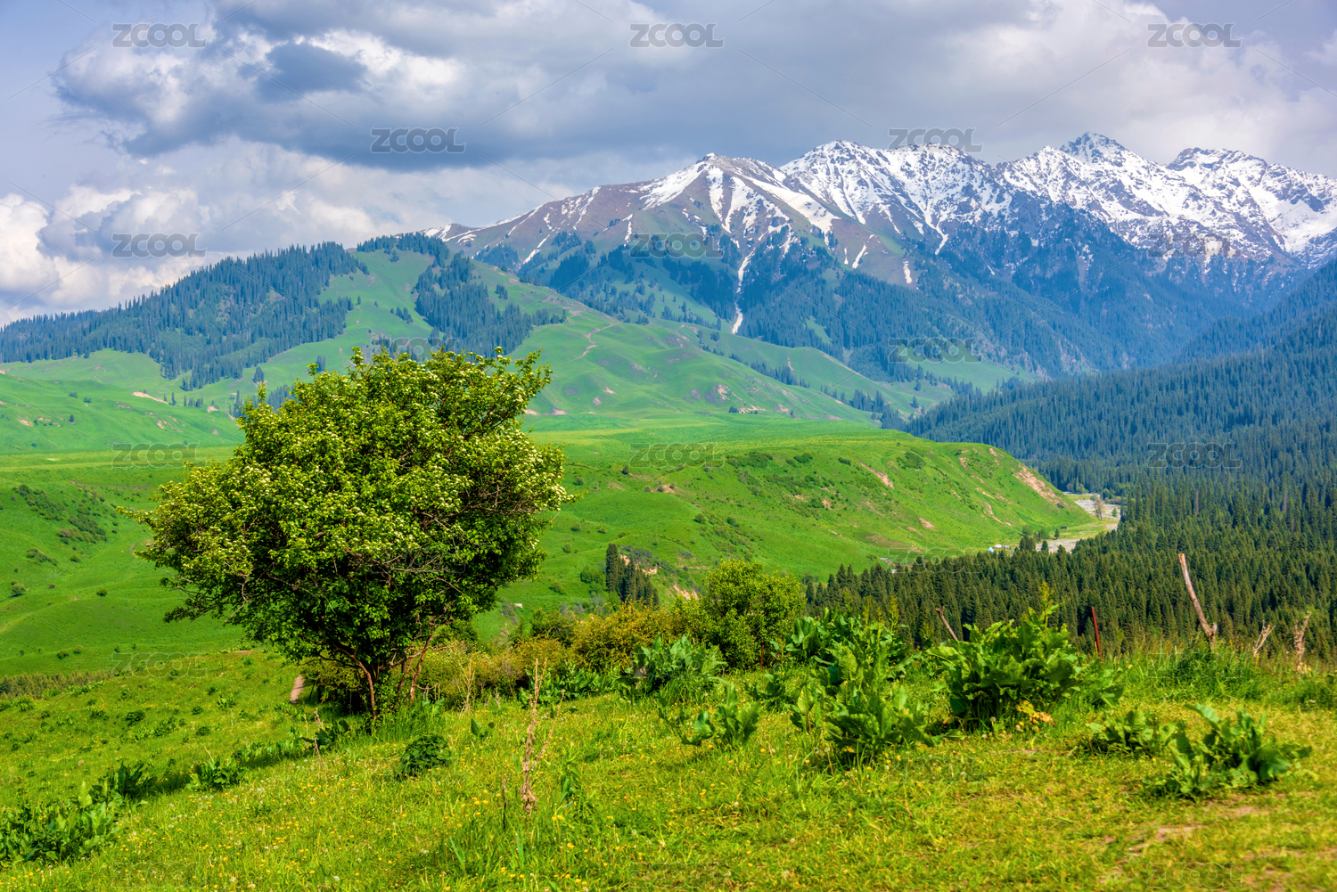 中国新疆伊犁恰西雪山森林草原风光