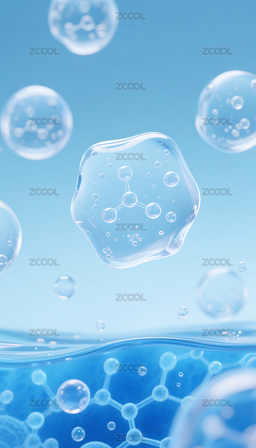 蓝色透明微小气泡和分子结构背景