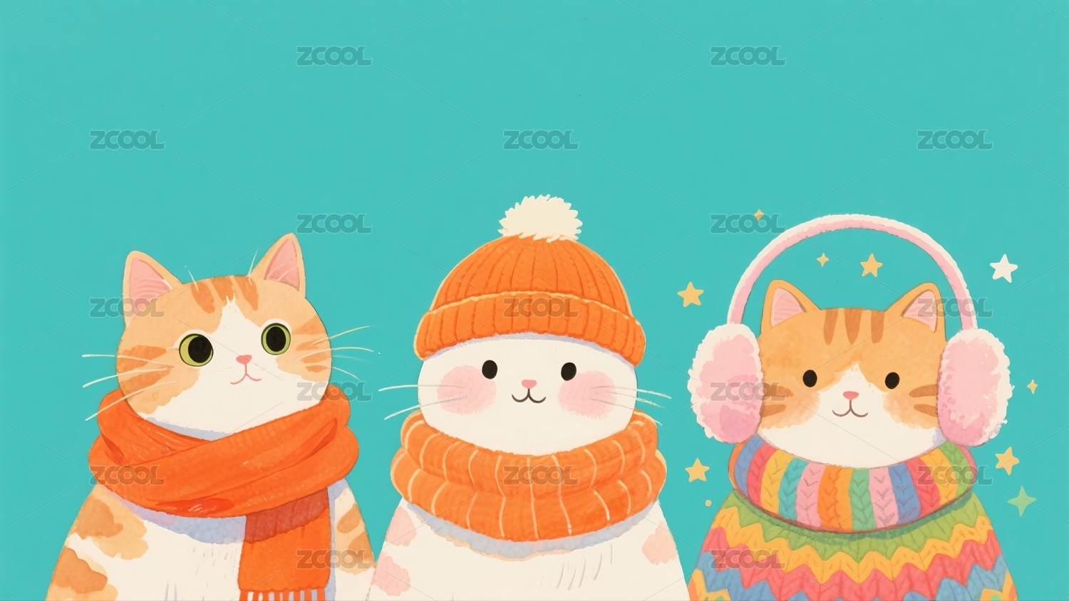 三只猫咪戴着帽子围巾