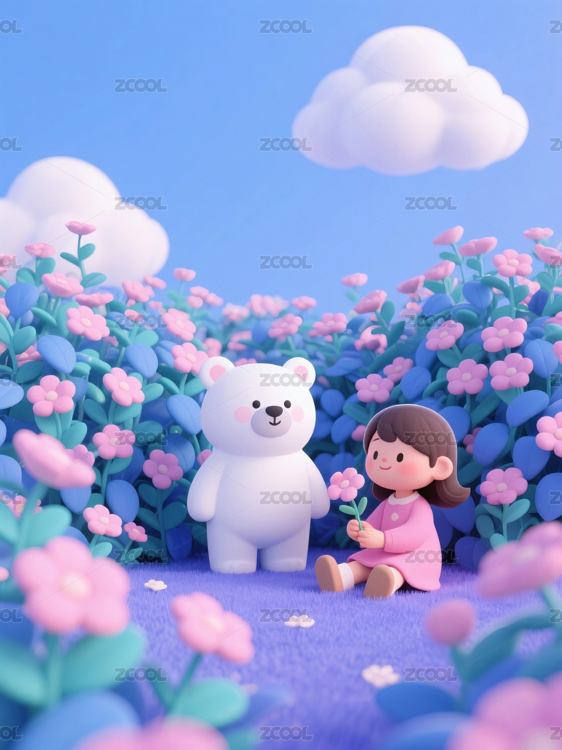 女孩与白熊在花丛中