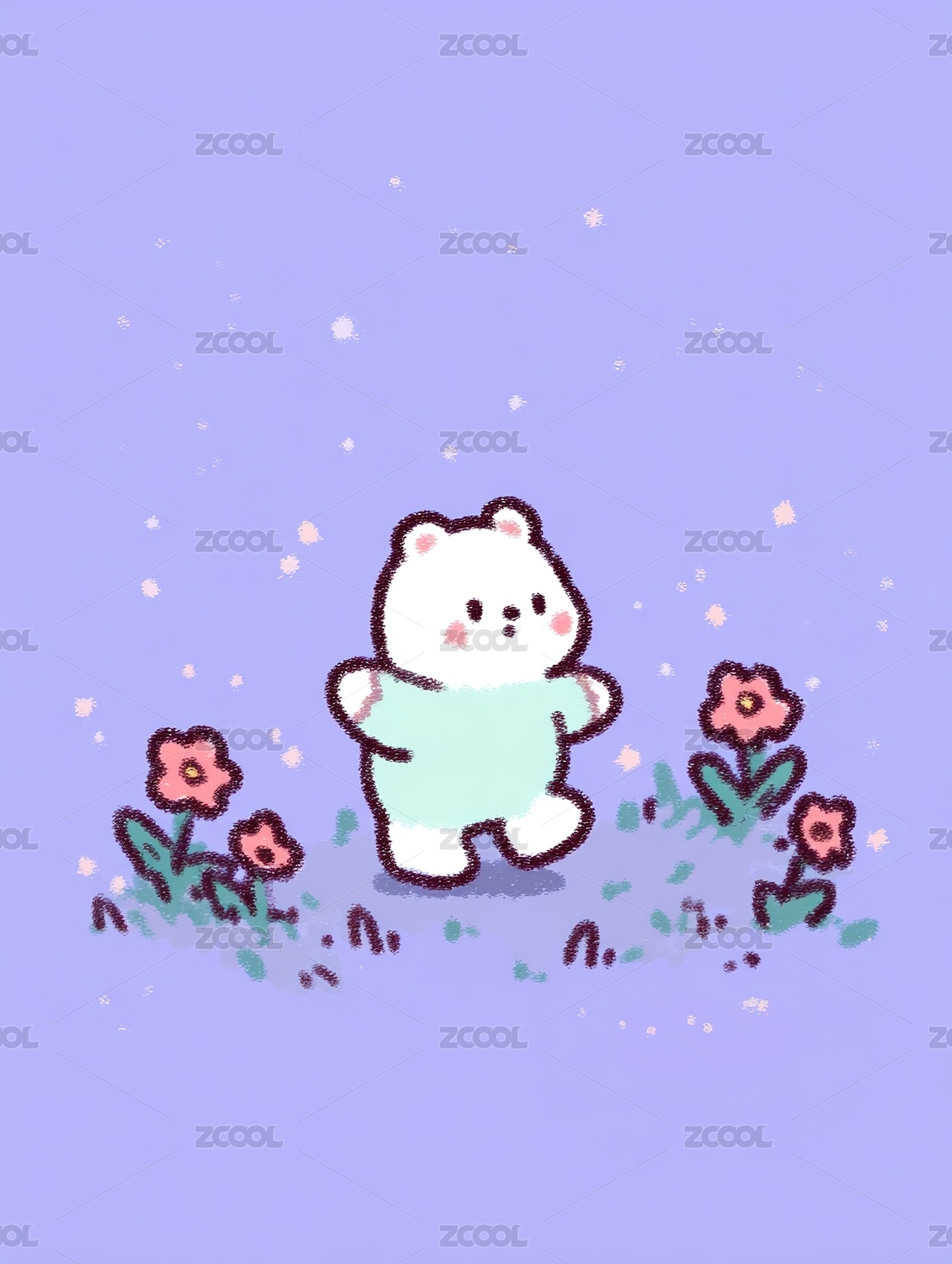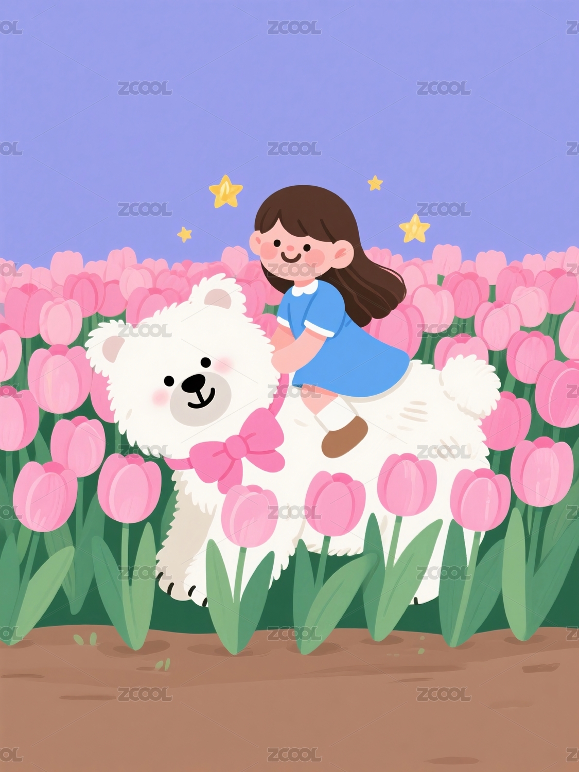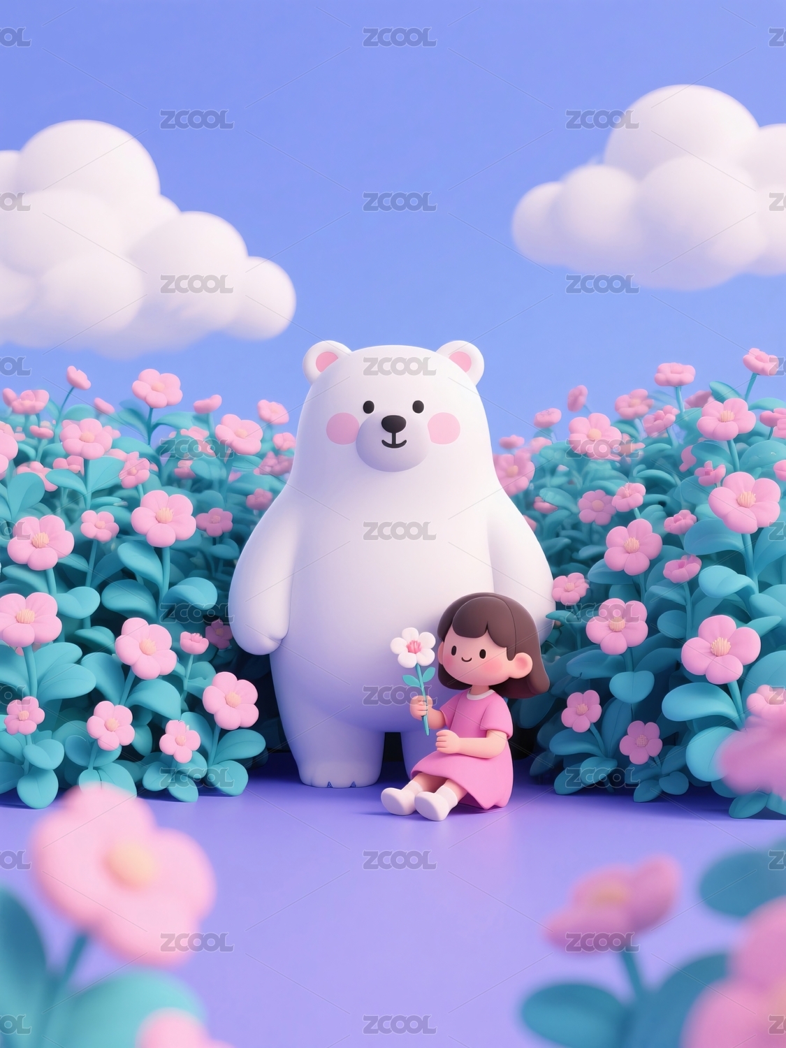 女孩与北极熊在花海之中