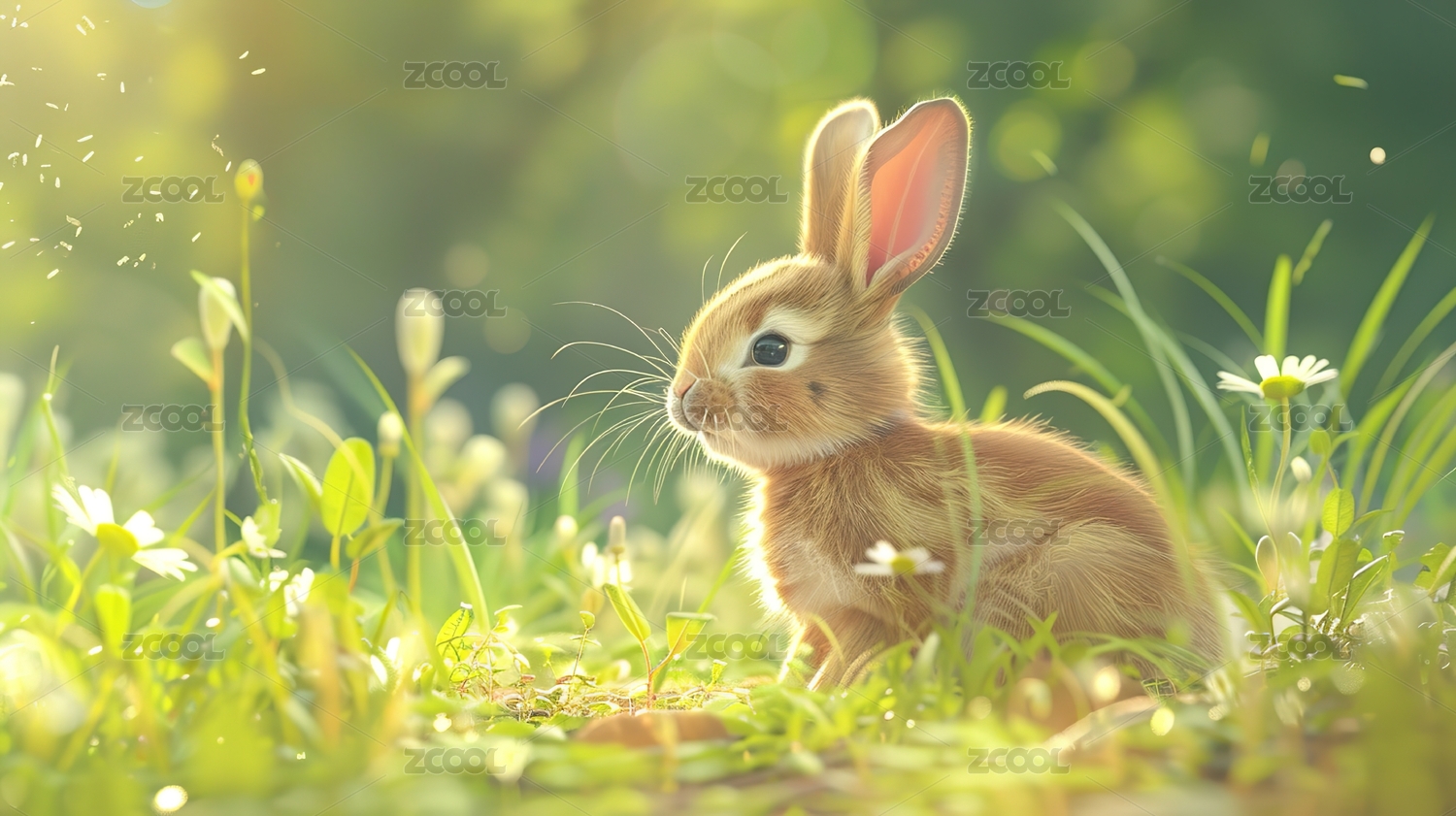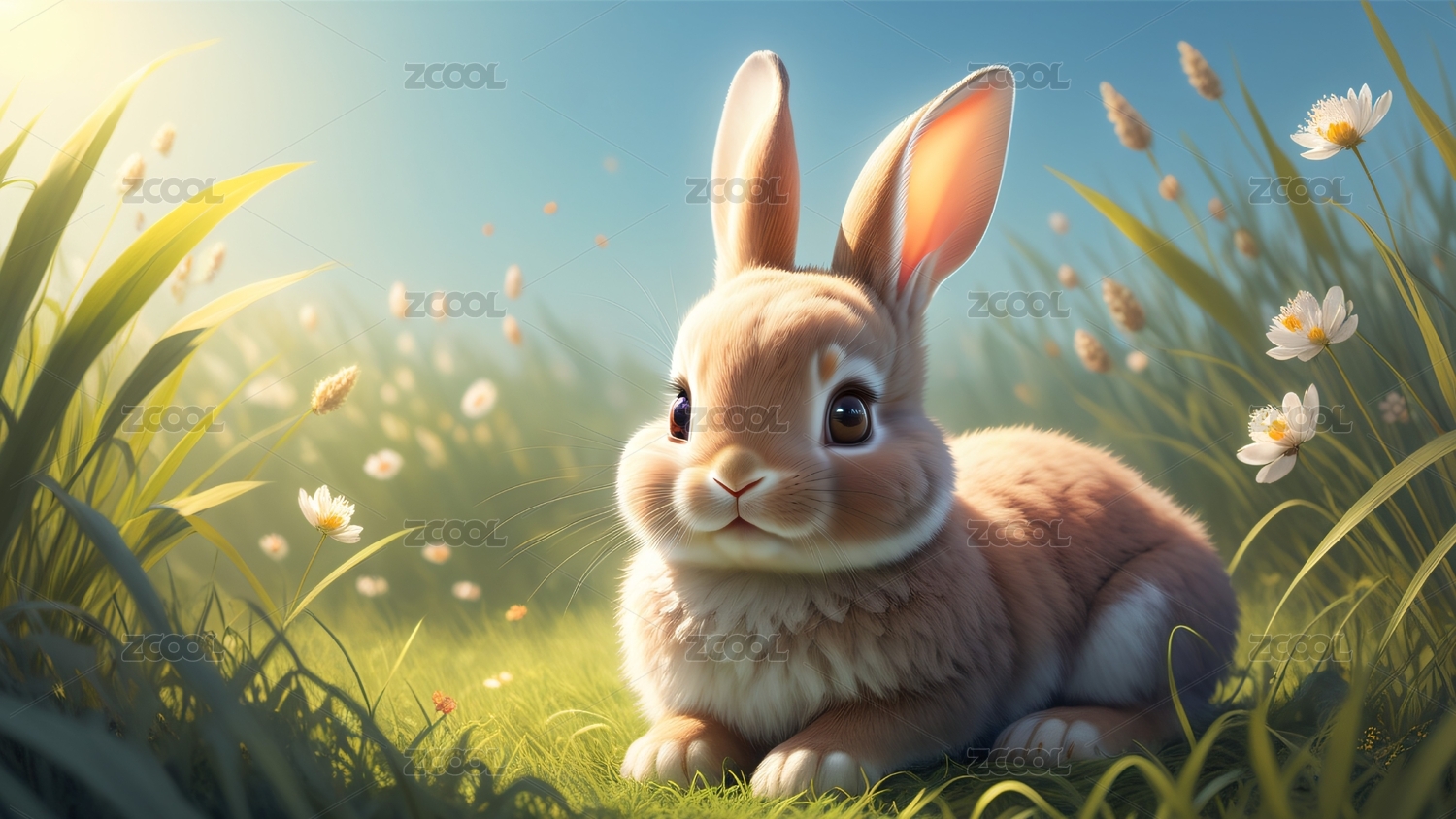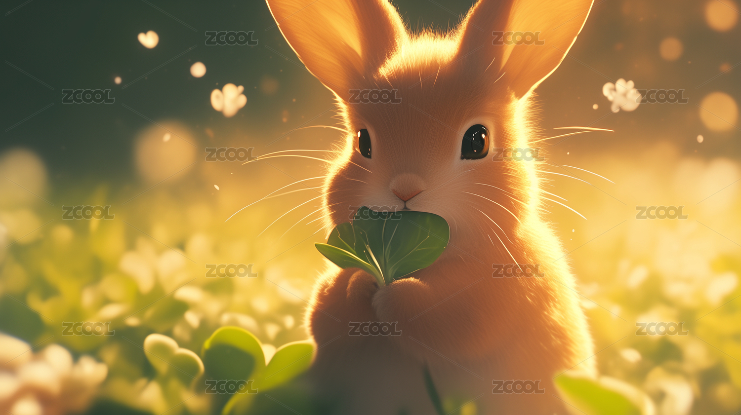 一只小兔子在黄昏的草丛中,3D卡通插画