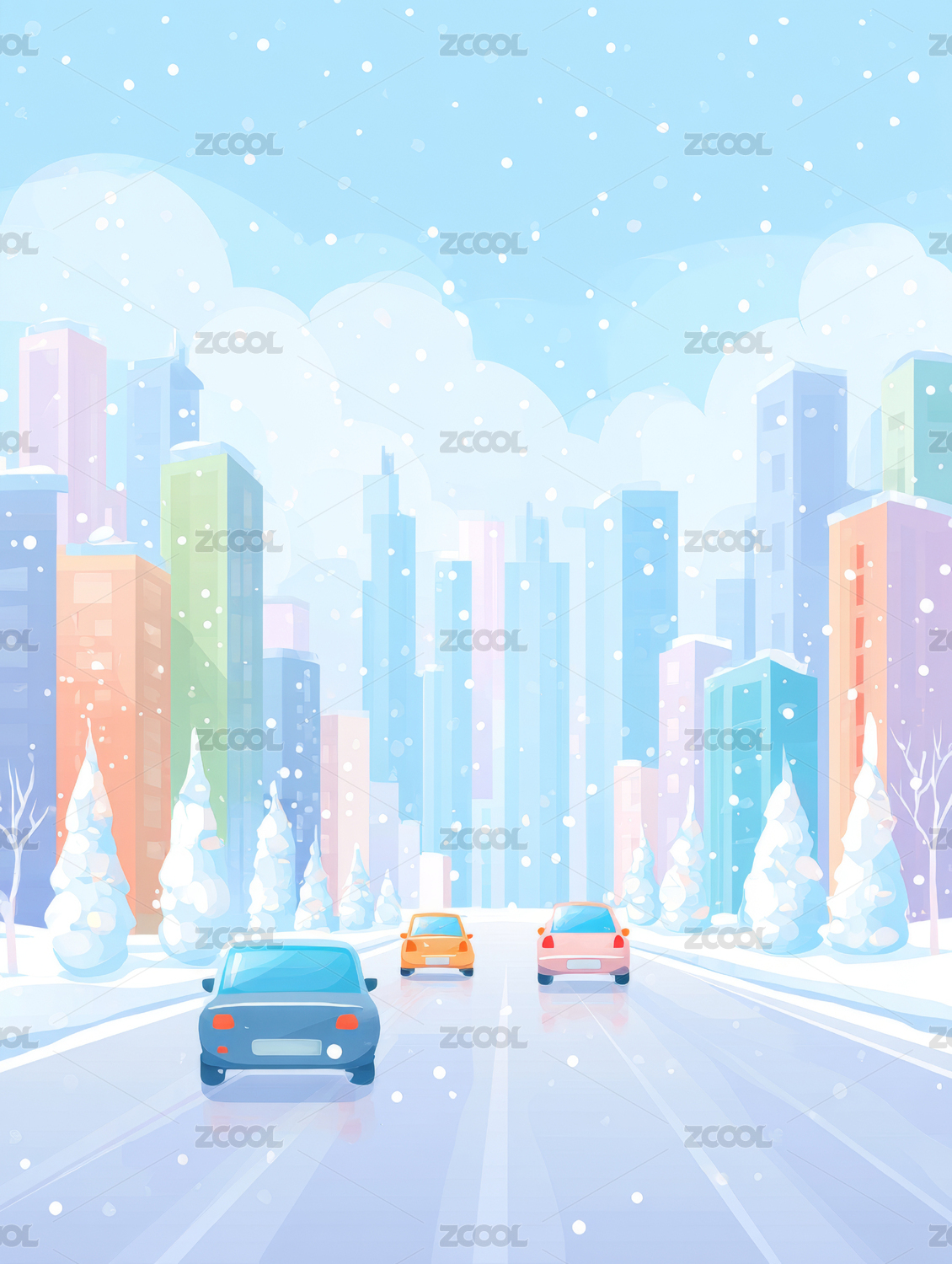 冬季,城市,雪景,道路,树木,建筑,汽车,天空,云朵,卡通