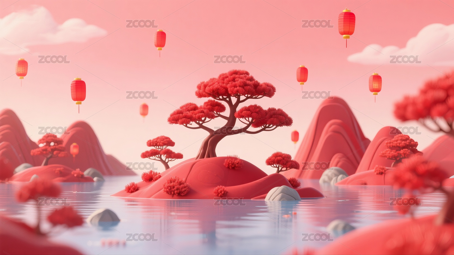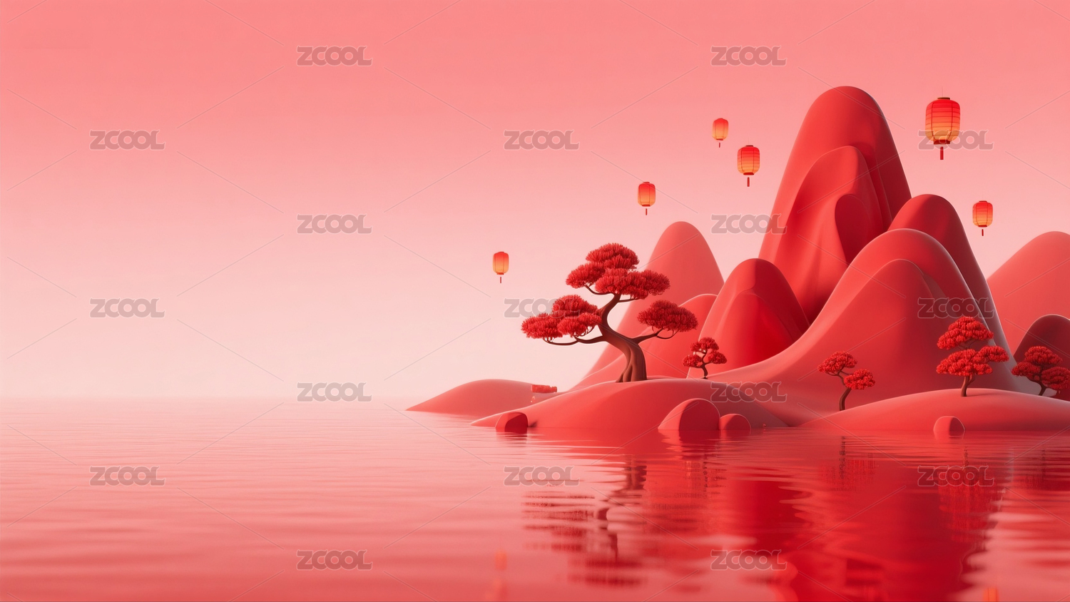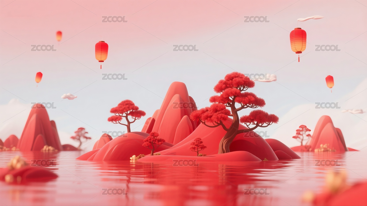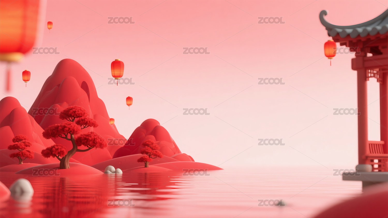 红色,中式,山水,古建筑,山脉,山,湖面,灯笼,春节,新年