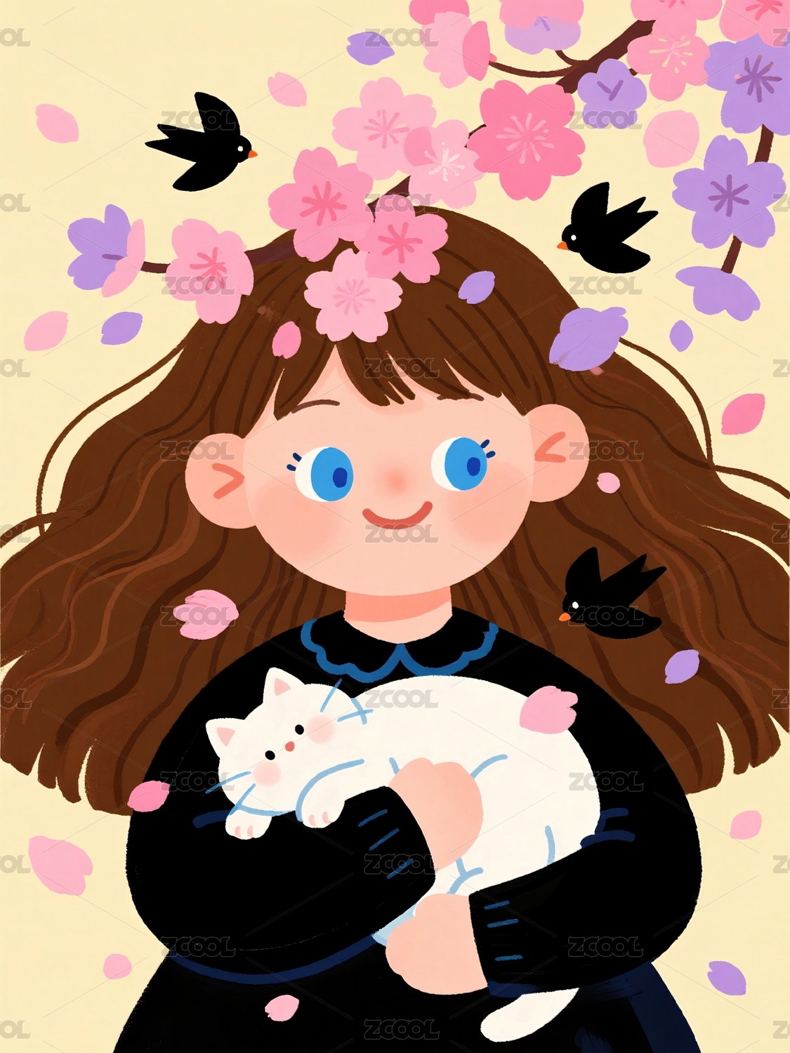 快乐的女孩在樱花花海里玩耍浪漫粉色插画