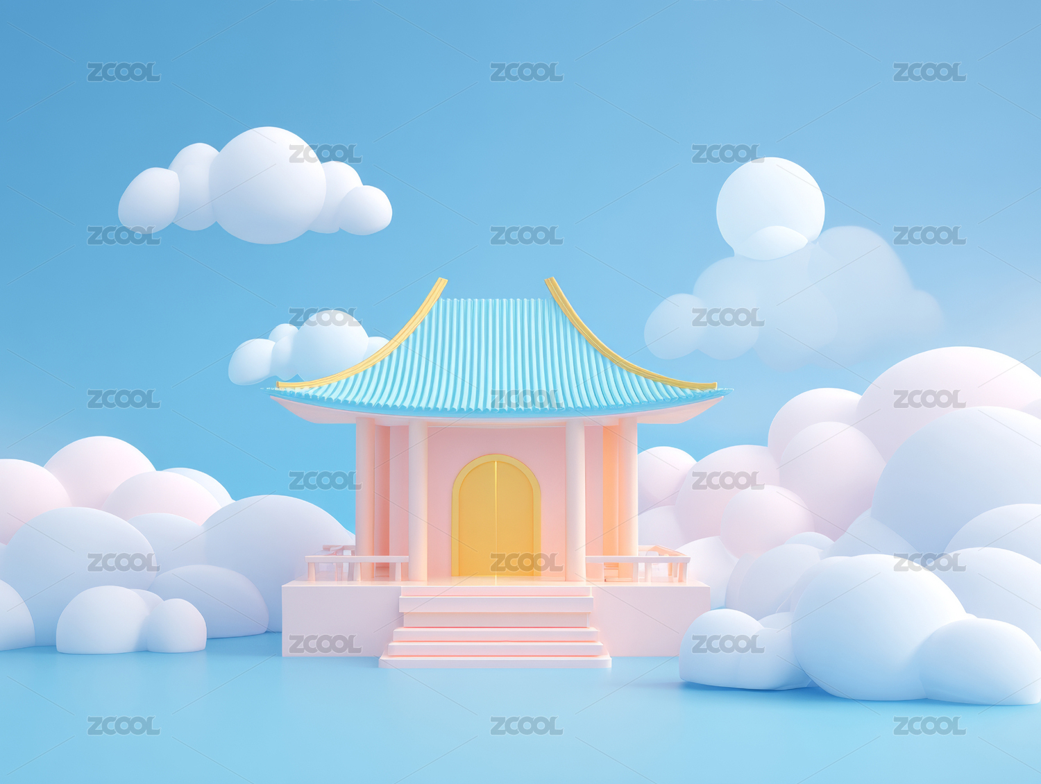 塔楼,绿树,蓝天,白云,卡通,建筑,简洁,3D,梦幻,和谐