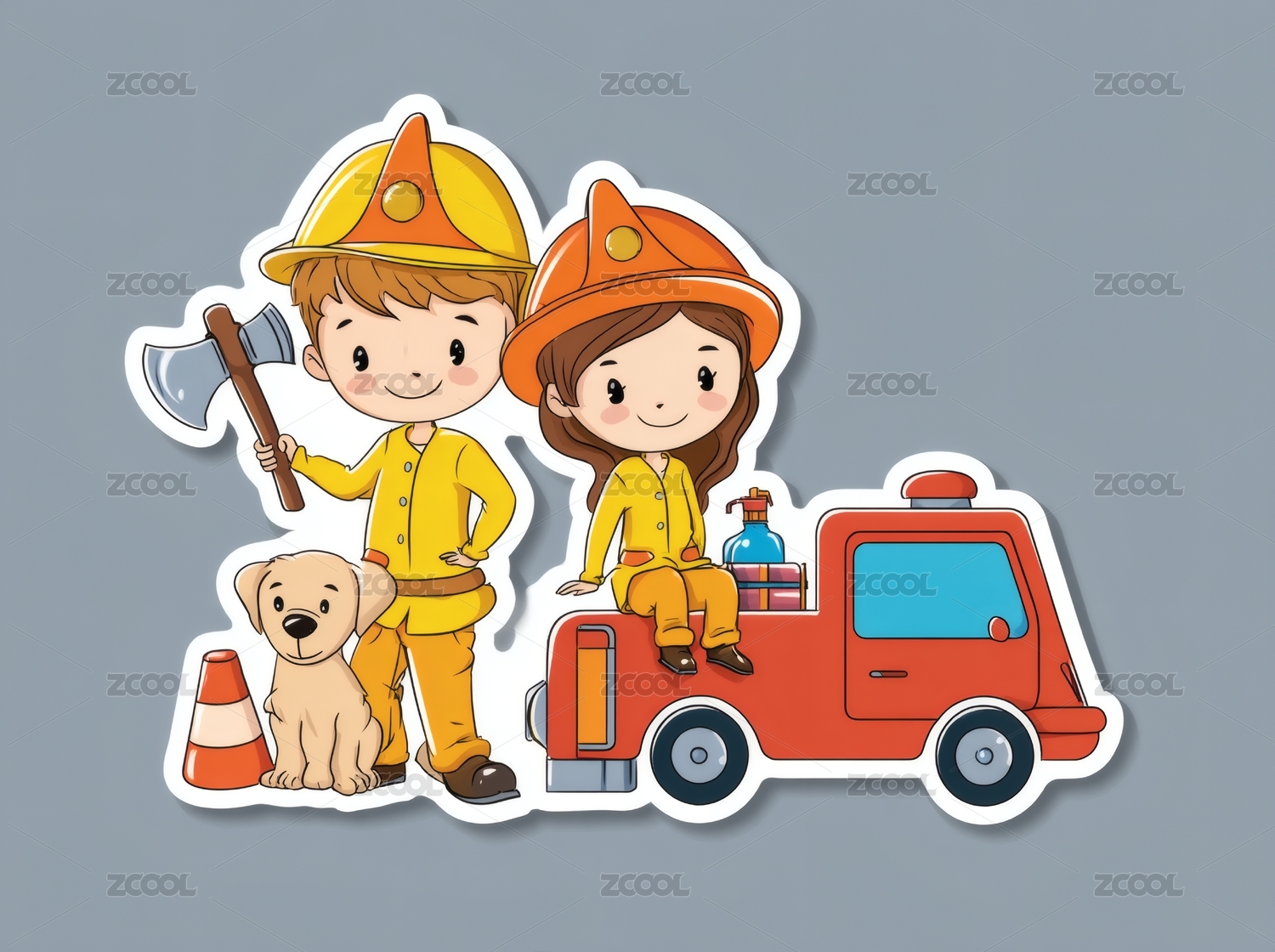 卡通,红色,可爱,消防员,人物,安全,救援,团队,插画,童趣