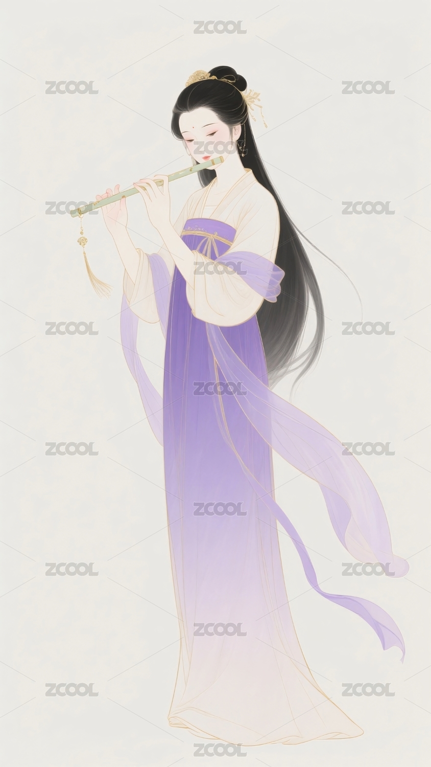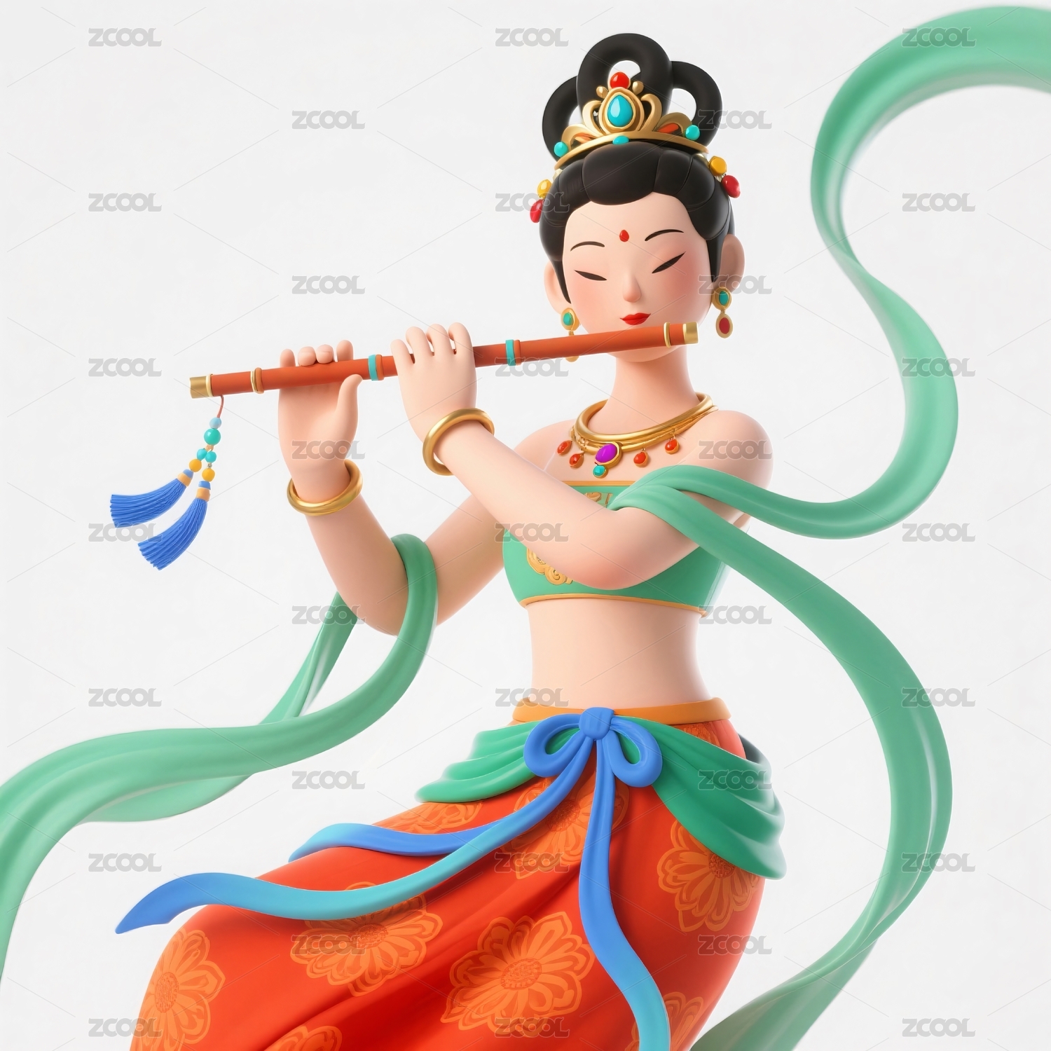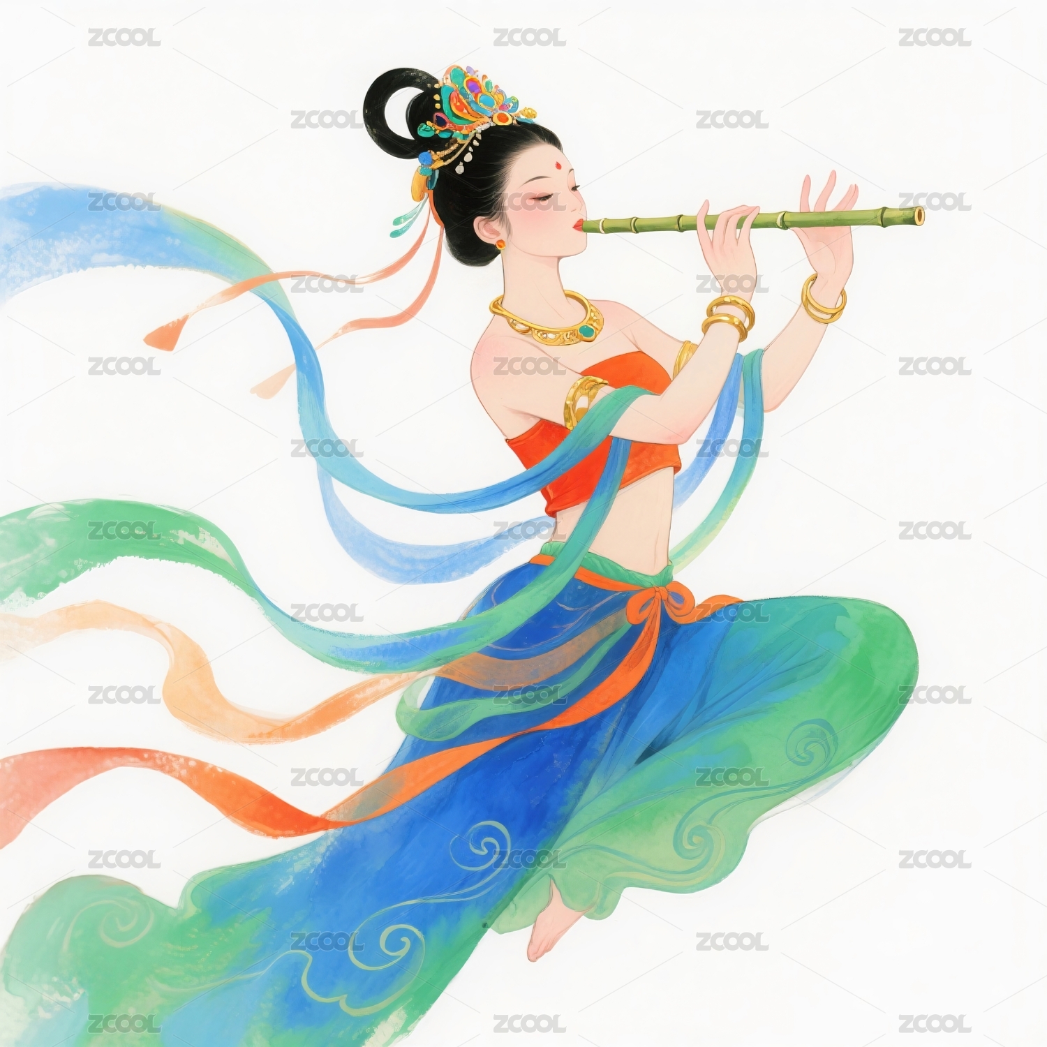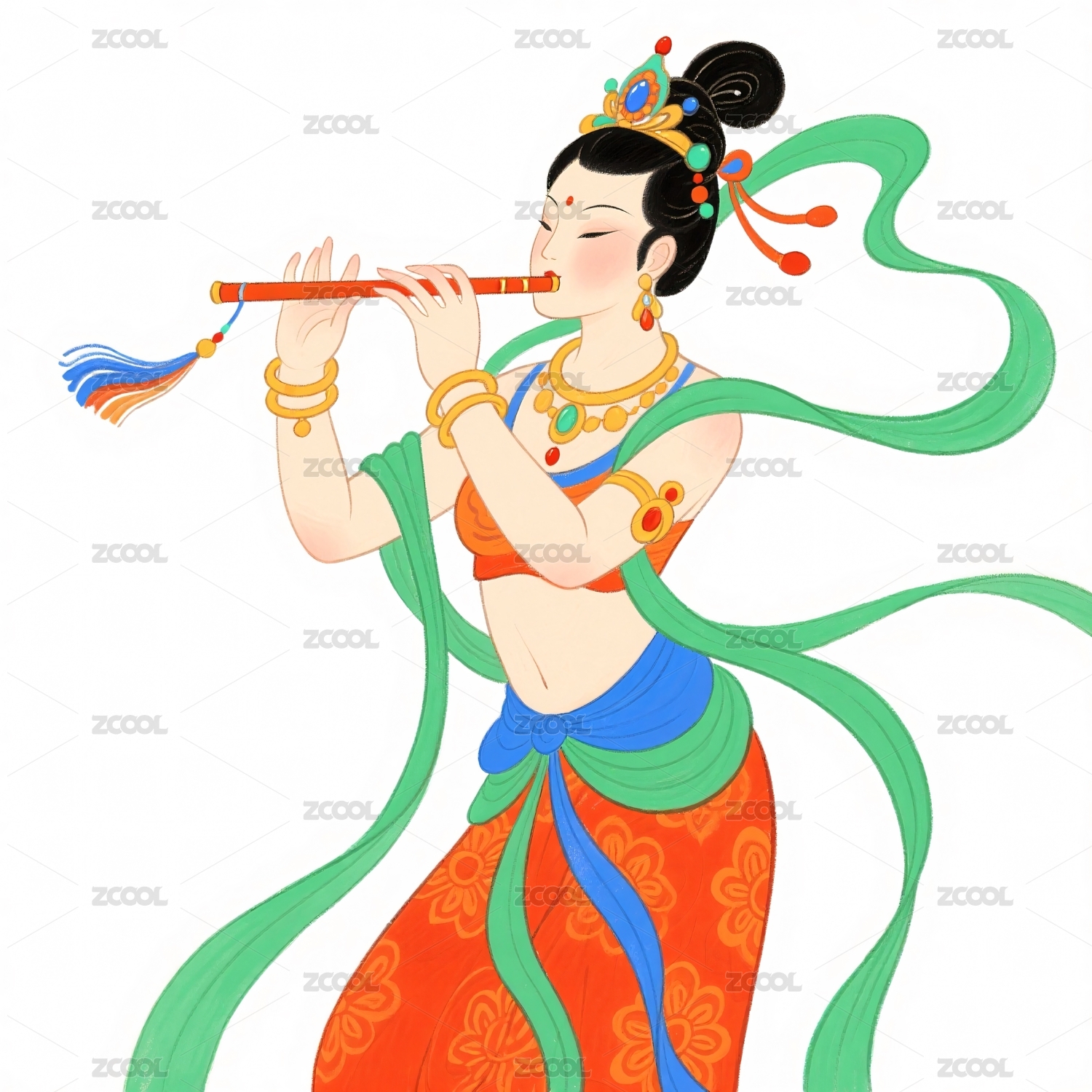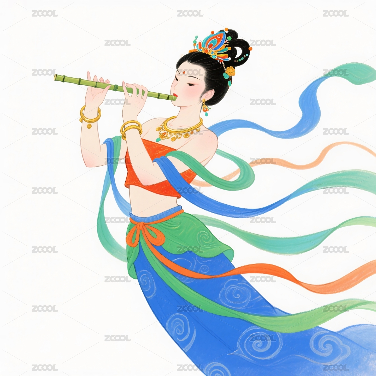蓝色,人物,女子,吹笛,飘带,演奏,乐器,姿态,绿色,红色