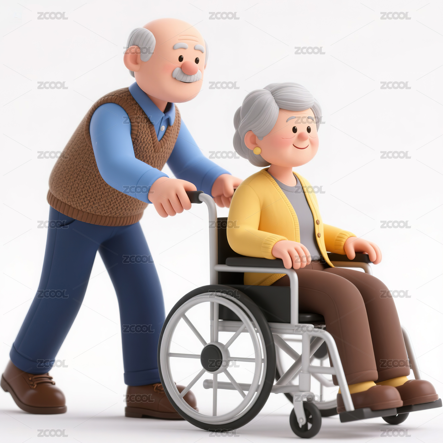 一个老头推着坐轮椅的老太太3d插画