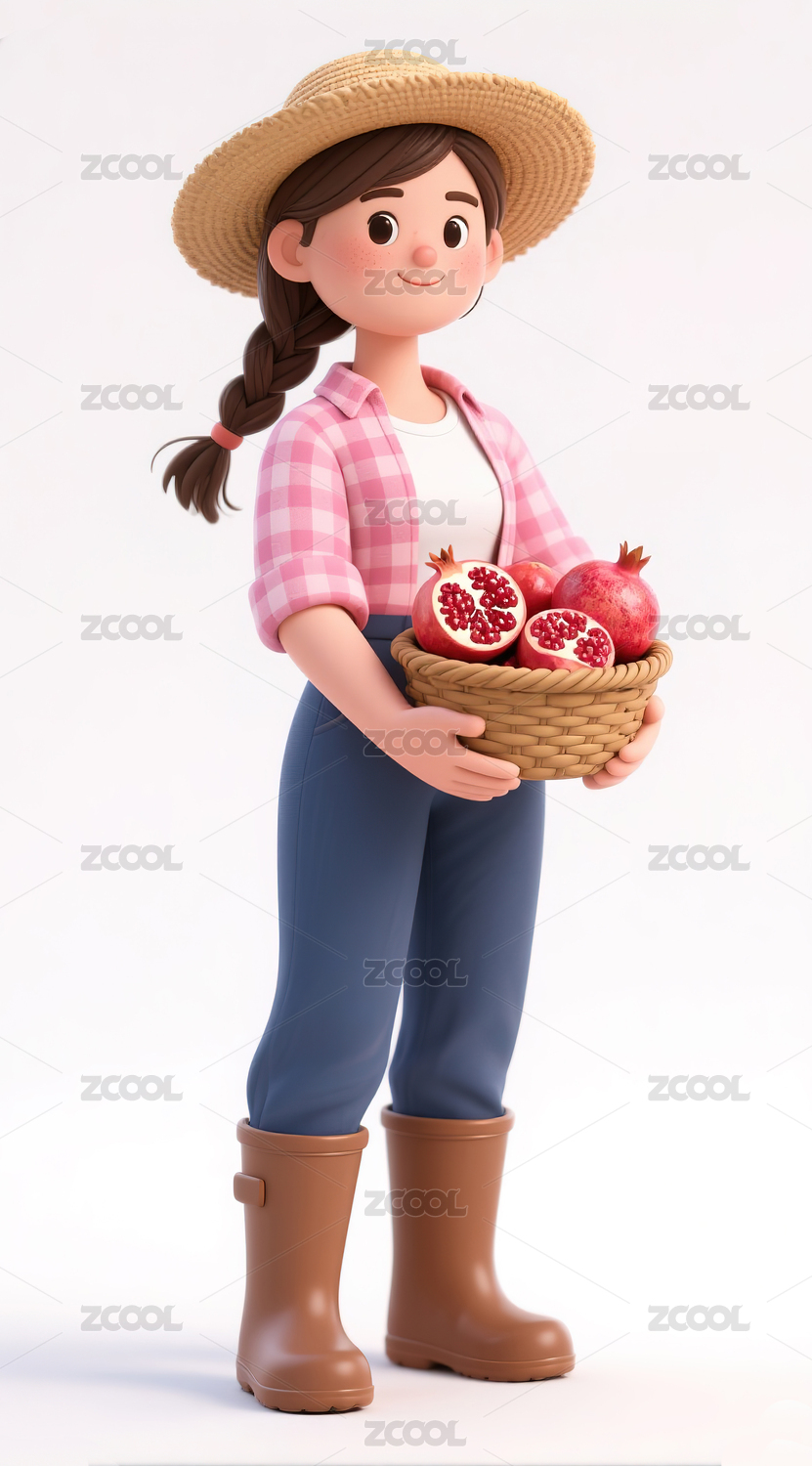抱着一筐成熟石榴的农民3d插画