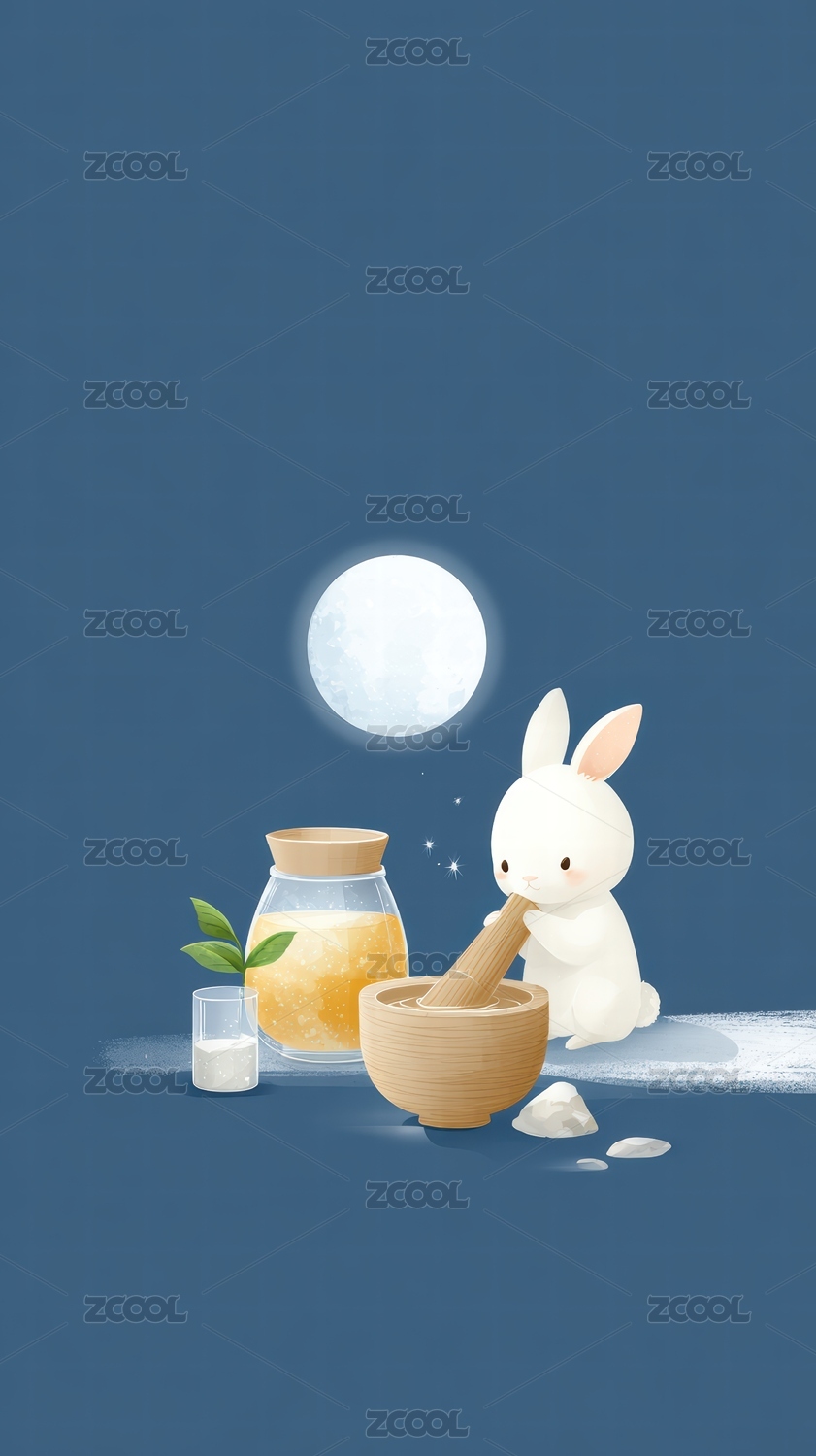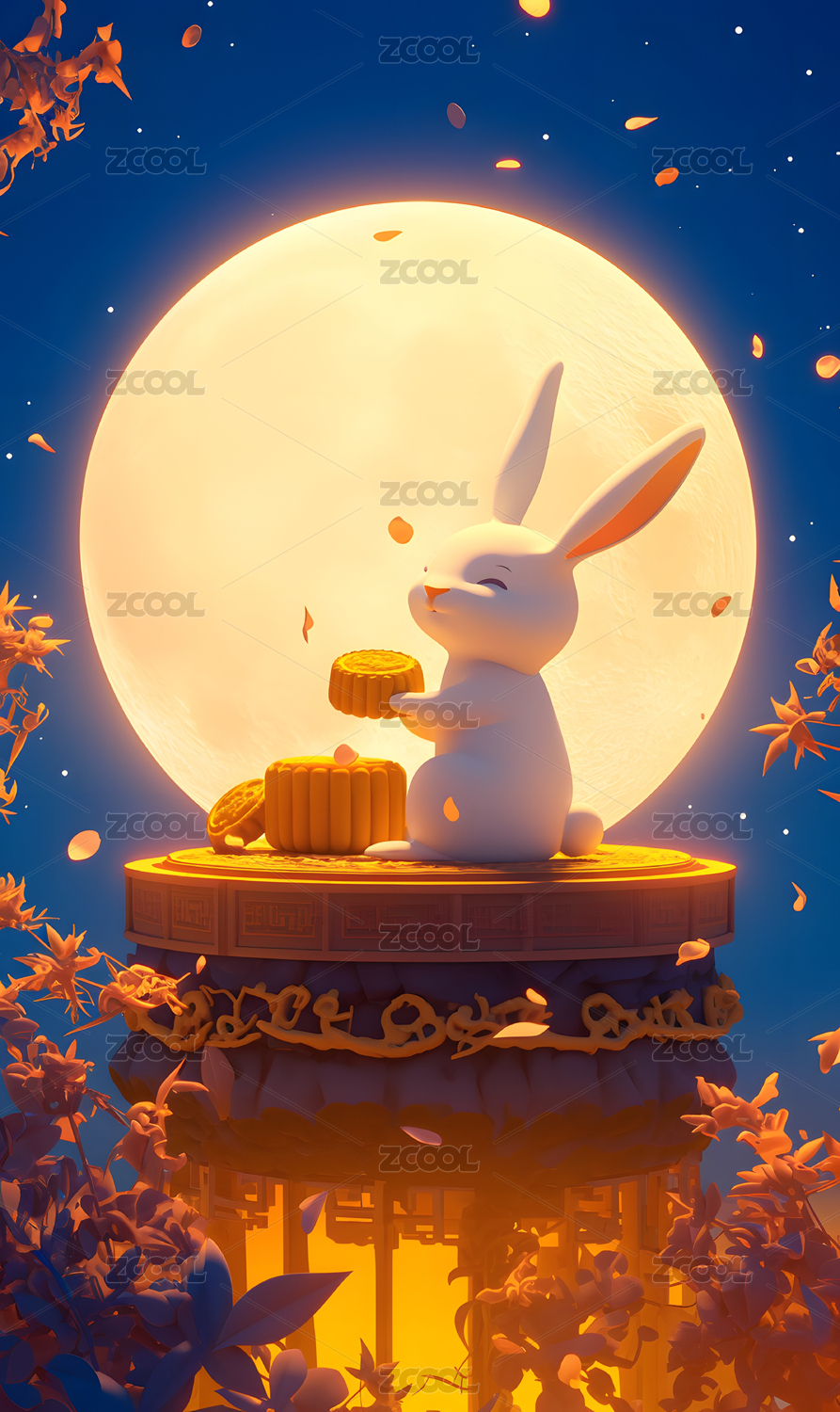 兔子在赏月吃月饼,夜空的满月,中秋节背景