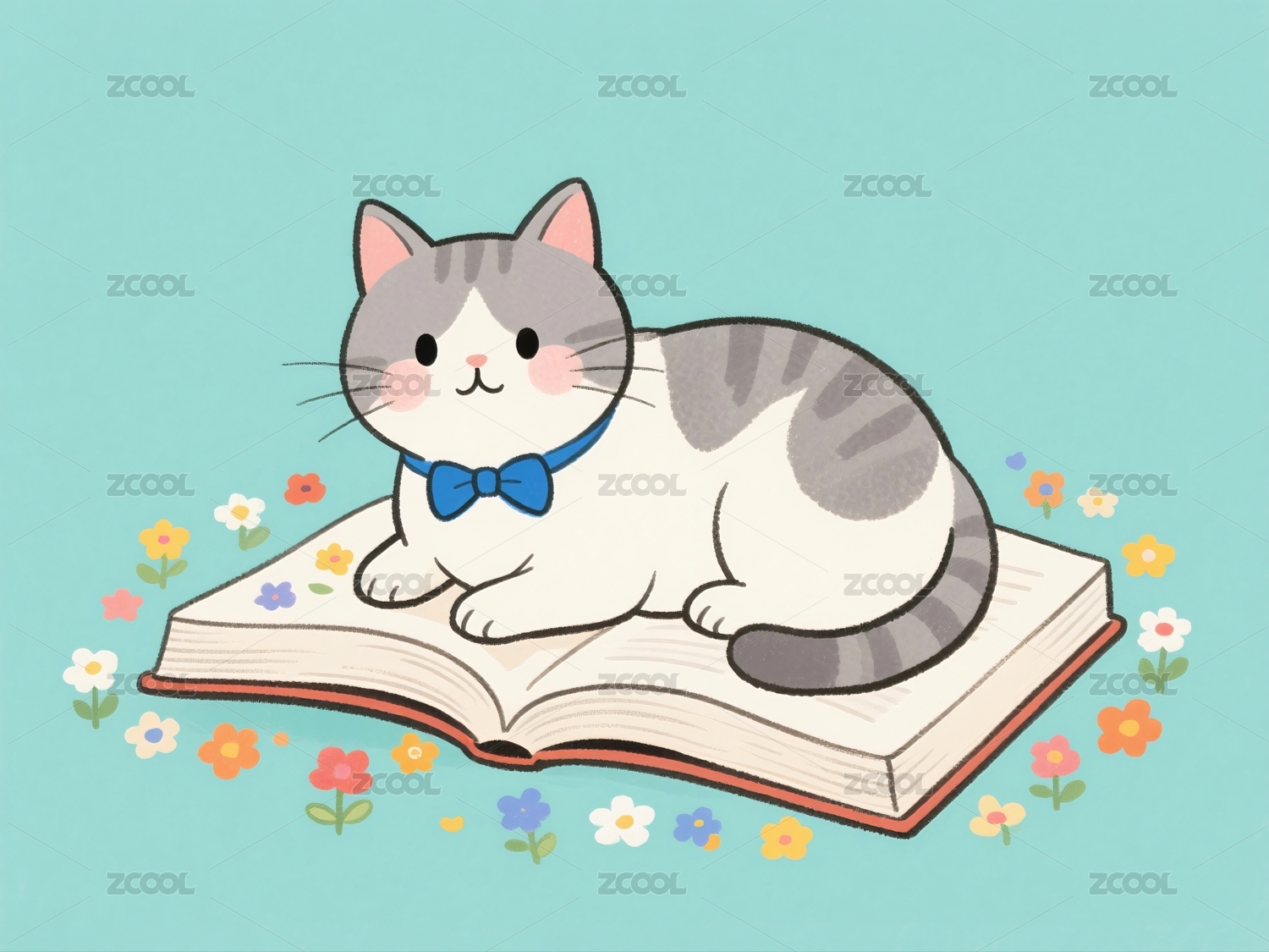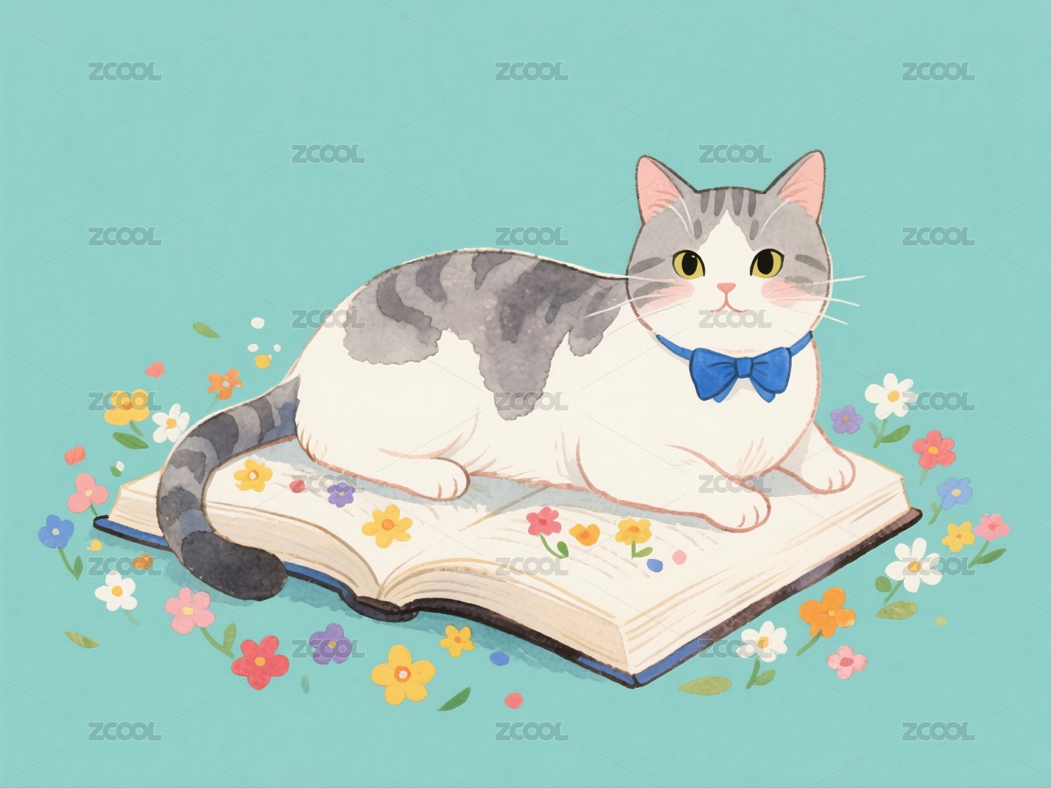 猫咪阅读书籍周围环绕鲜花