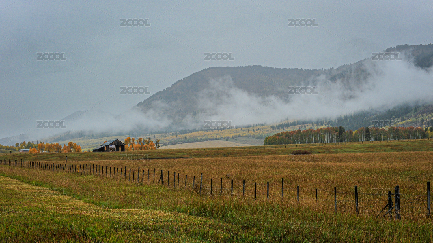 大提顿国家公园,GrandTeton,秋天,云层,云雾,田野,山脚,房屋,围栏,金黄
