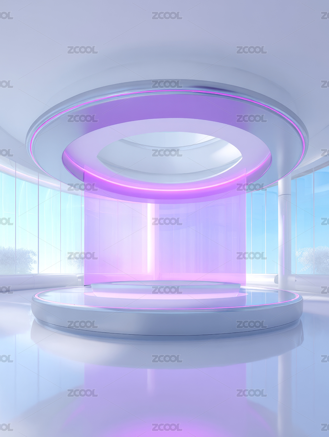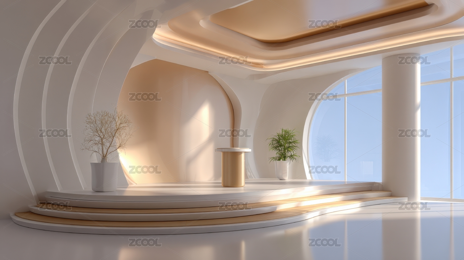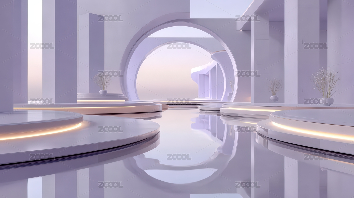 现代,简约,室内,设计,圆形,灯光,装饰,白色,植物,未来感