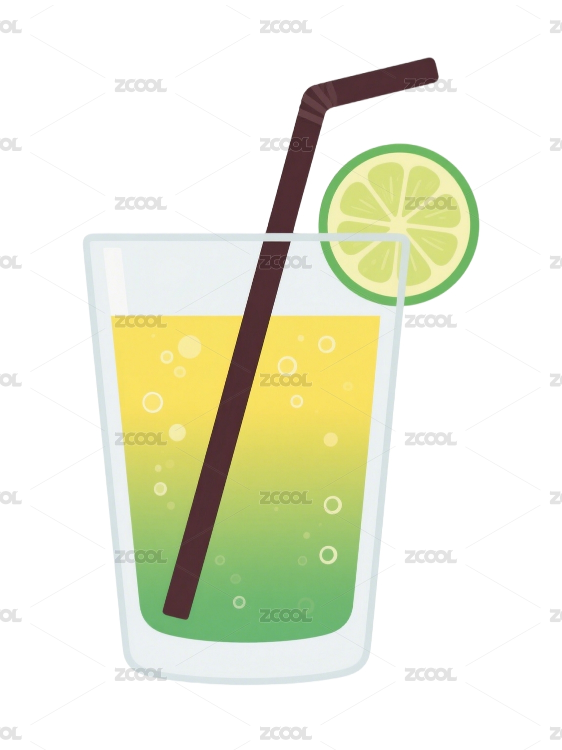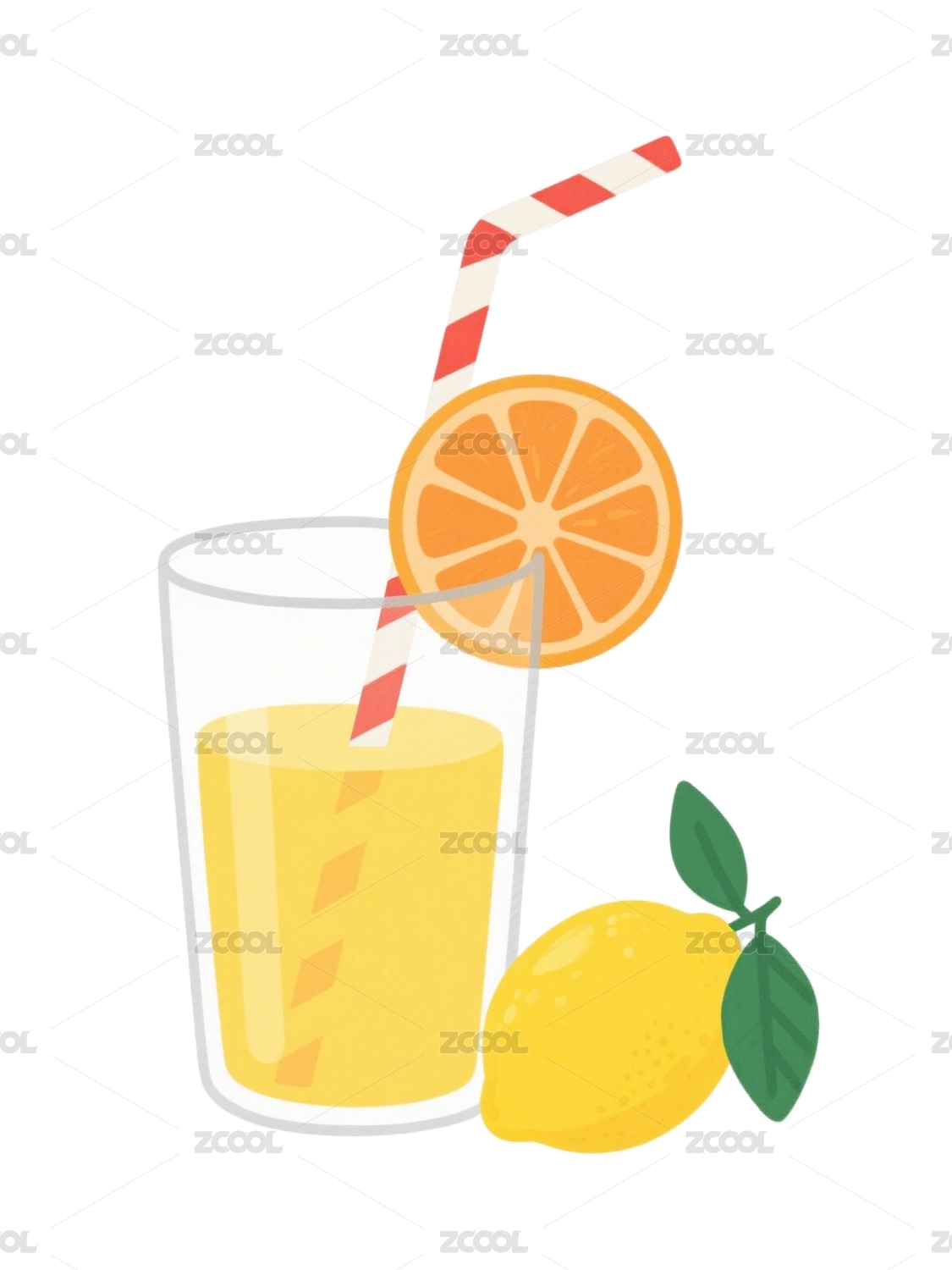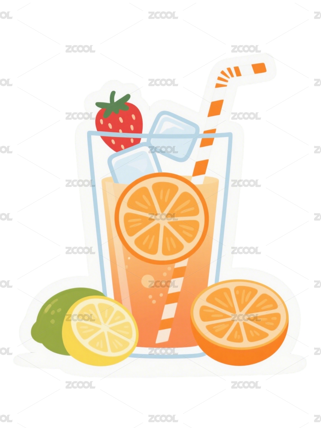 玻璃杯,冰块,橙子片,夏季饮品,简约设计,橙汁,条纹吸管,插画素材,水果饮料,卡通风格