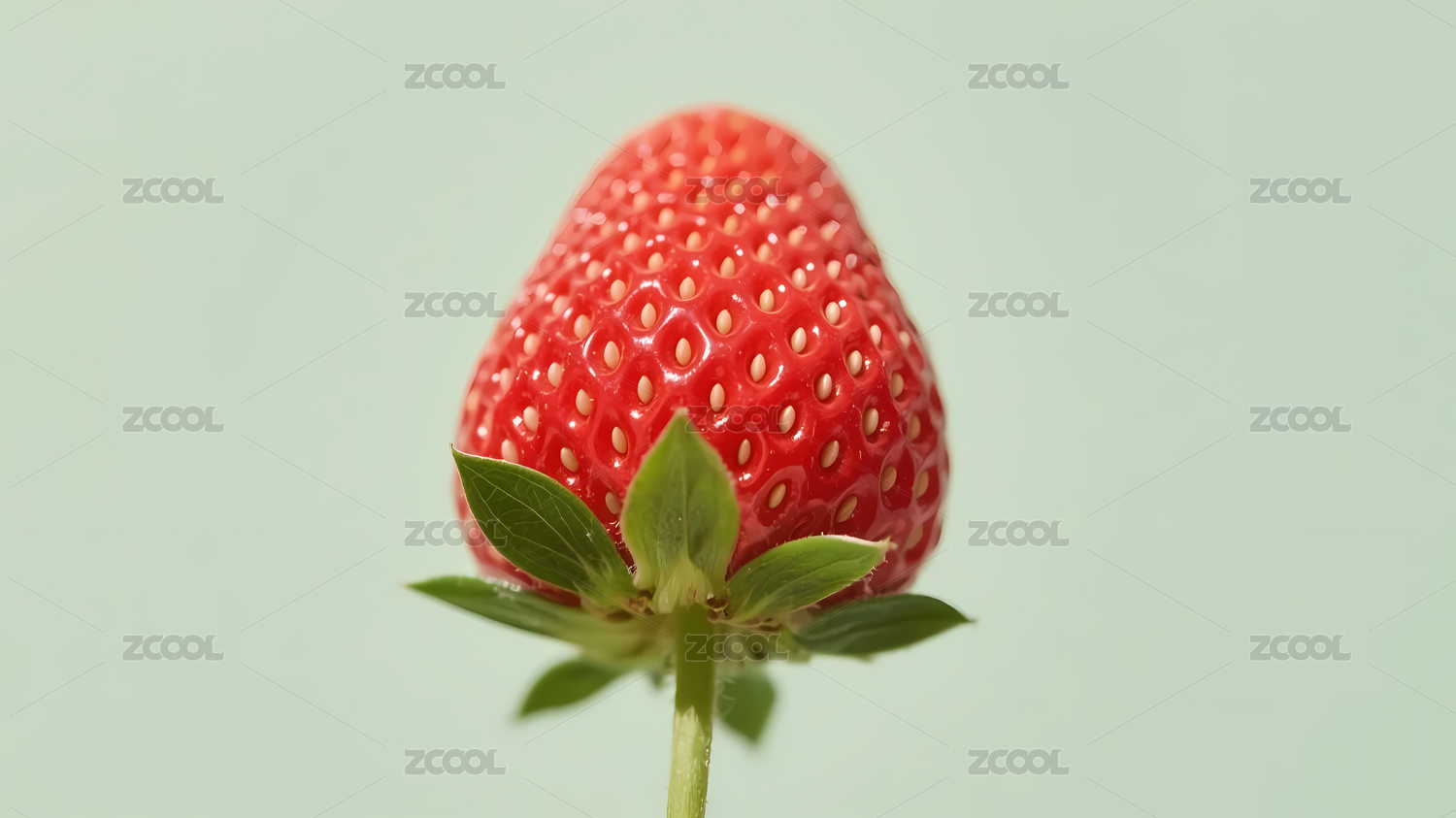 棚拍静物绿色叶子垫着的单个新鲜草莓特写
