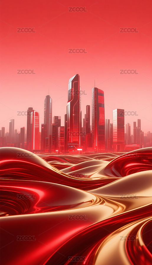 红色流动金属质感城市建筑背景