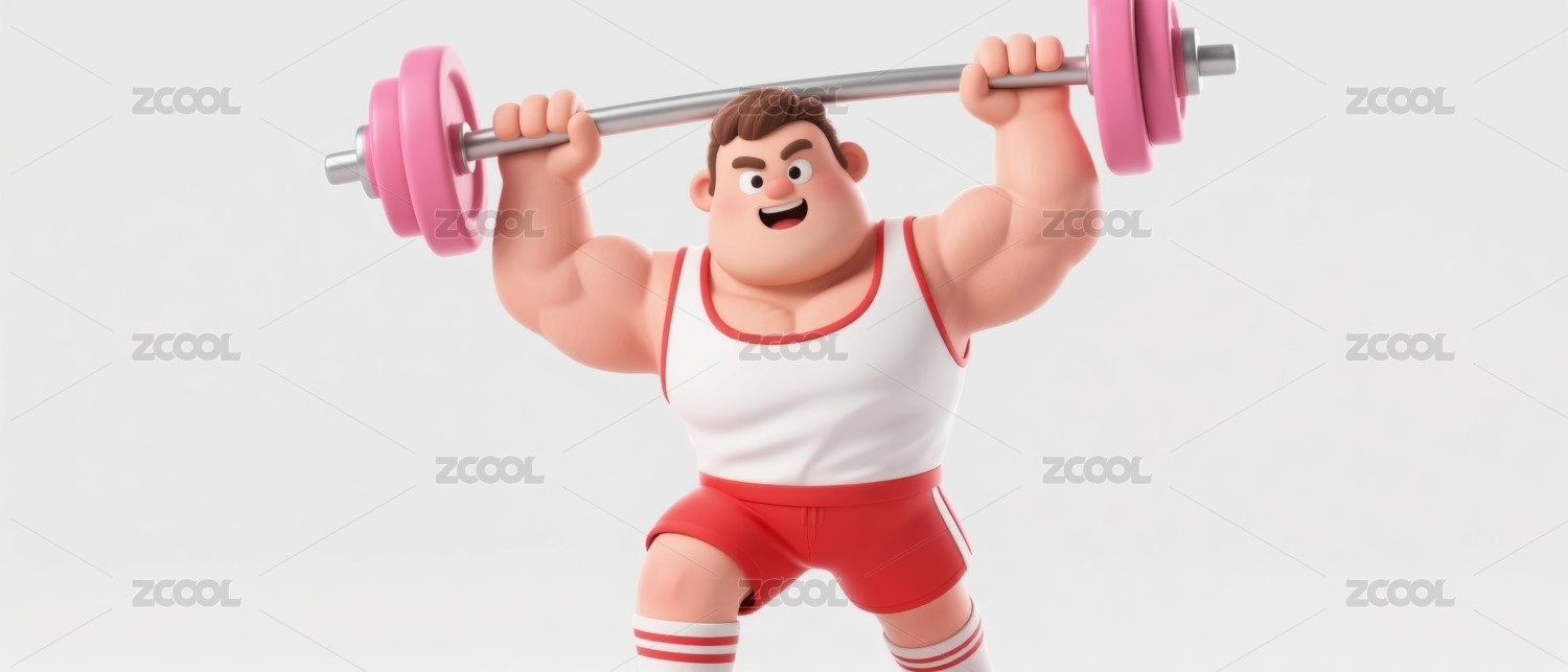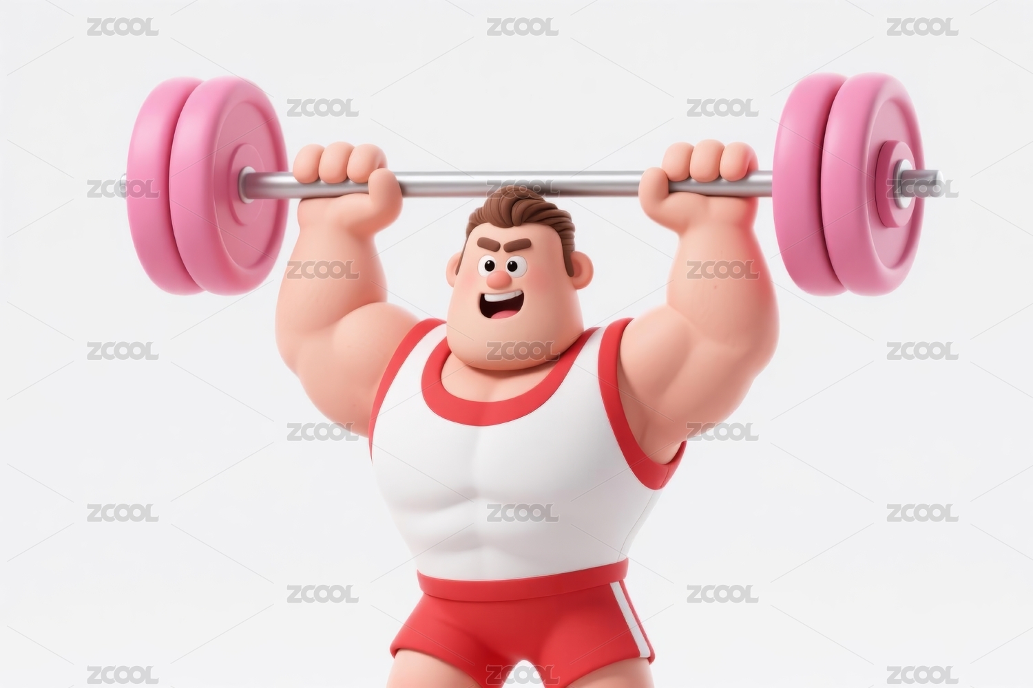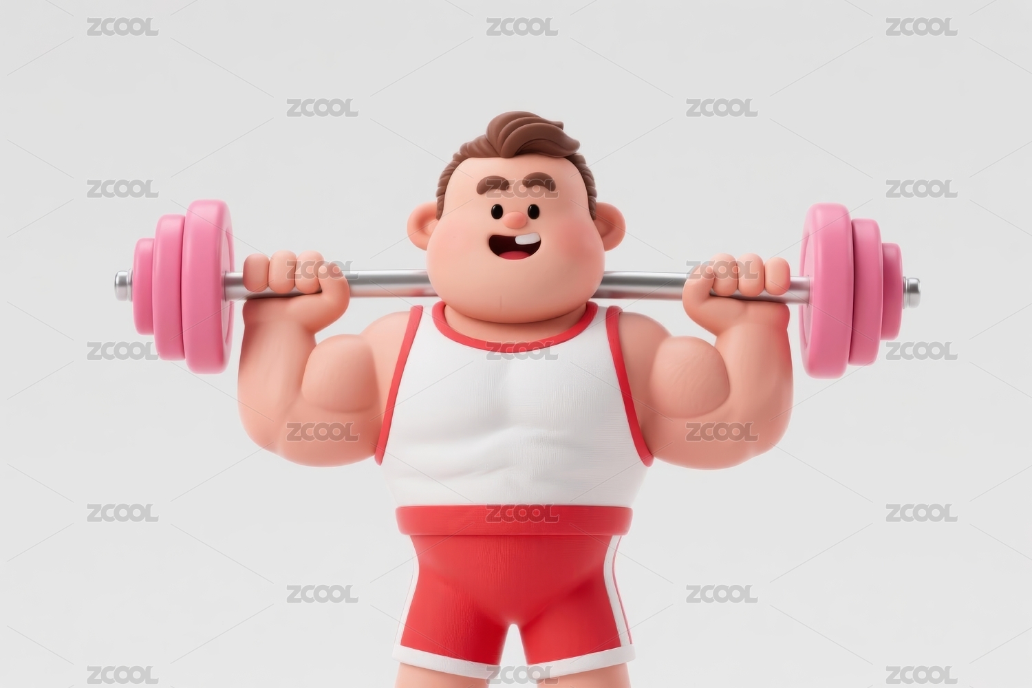 夸张举重双手举杠铃的男孩3D卡通插画绘画