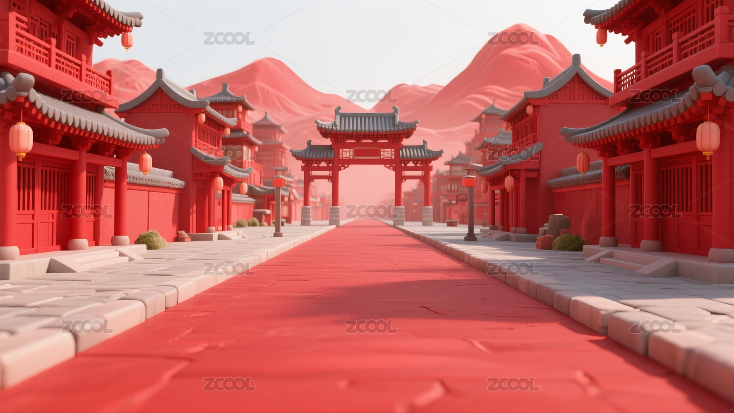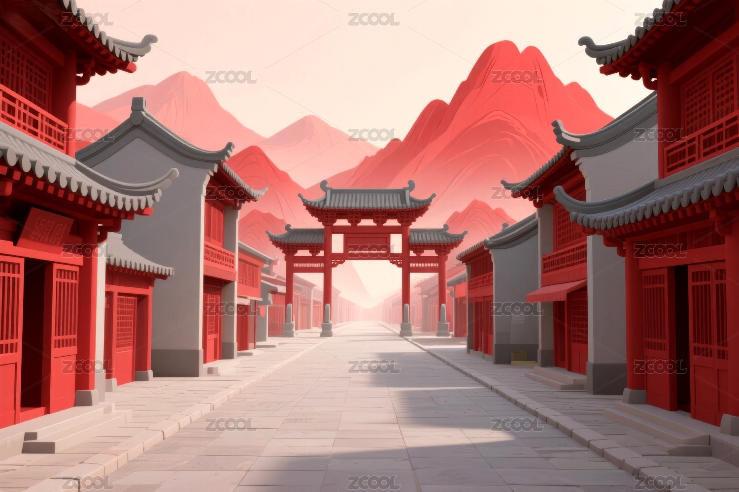 中国风古镇红色新年街景建筑