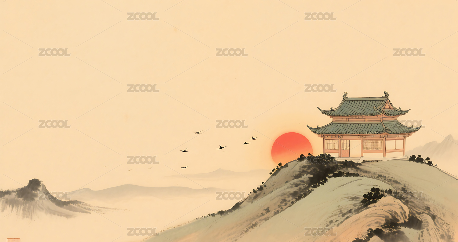 低饱和橘黄色山水古建筑插画背景