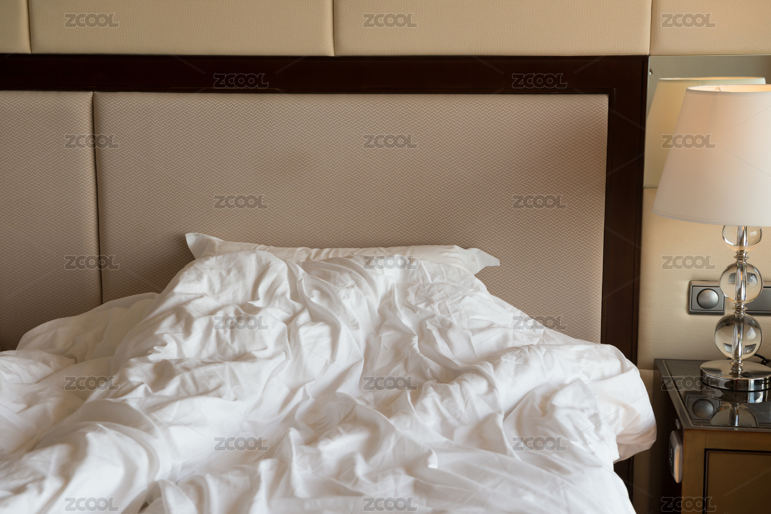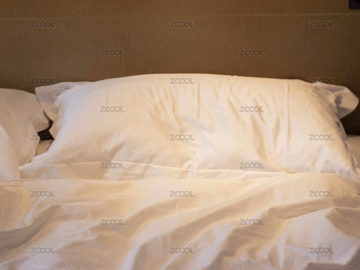 酒店客房床头枕头杯子局部特写