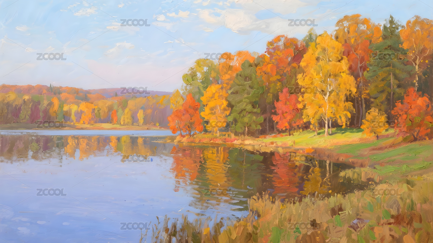秋日湖畔的色彩交响油画