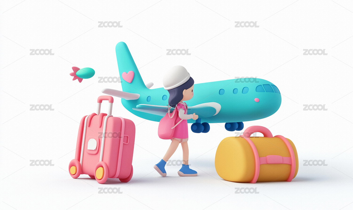 旅行,旅游,行李箱,太阳伞,飞机,插画,可爱风,卡通,3d卡通