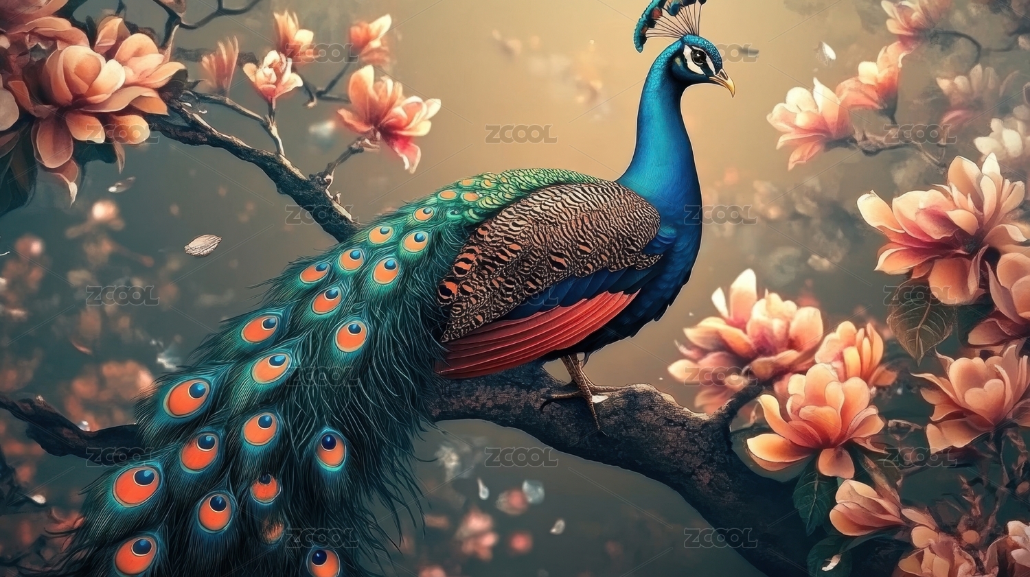 蓝绿孔雀与樱花森林